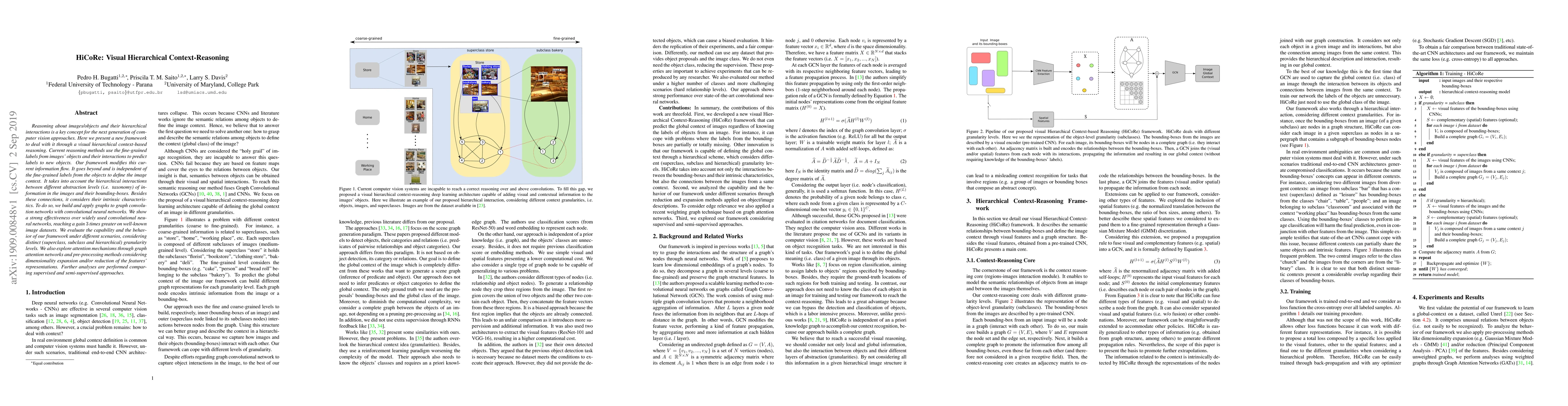 HiCoRe is a novel framework for visual hierarchical context-reasoning that leverages graph convolution networks to model interactions across different abstraction levels in images. It demonstrates significant performance gains over traditional convolutional neural networks on benchmark datasets.