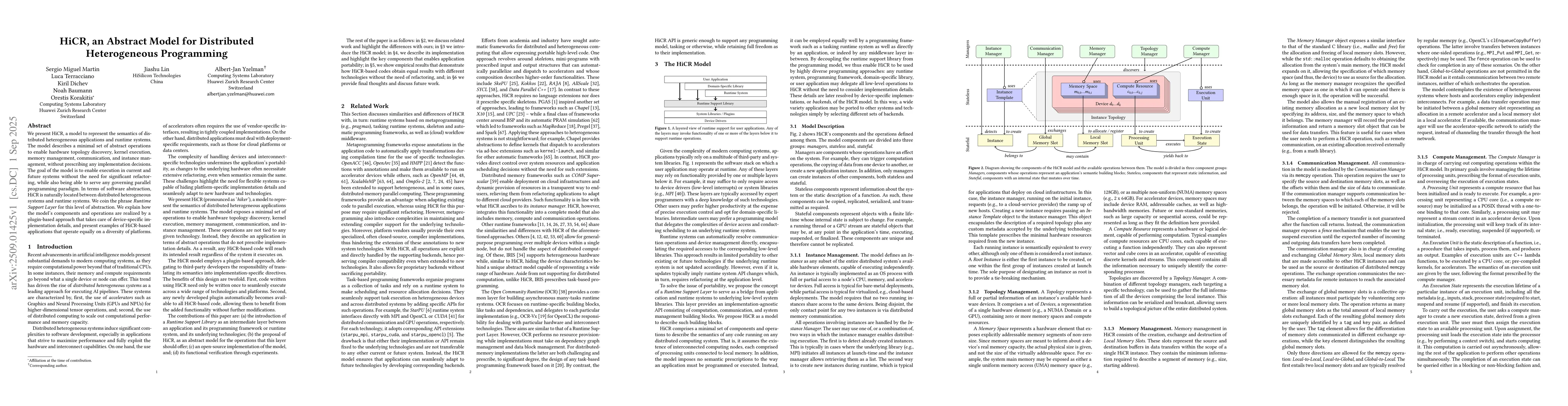 We present HiCR, a model to represent the semantics of distributed heterogeneous applications and runtime systems. The model describes a minimal set of abstract operations to enable hardware topology discovery, kernel execution, memory management, communication, and instance management, without prescribing any implementation decisions. The goal of the model is to enable execution in current and future systems without the need for significant refactoring, while also being able to serve any governing parallel programming paradigm. In terms of software abstraction, HiCR is naturally located between distributed heterogeneous systems and runtime systems. We coin the phrase \emph{Runtime Support Layer} for this level of abstraction. We explain how the model's components and operations are realized by a plugin-based approach that takes care of device-specific implementation details, and present examples of HiCR-based applications that operate equally on a diversity of platforms.