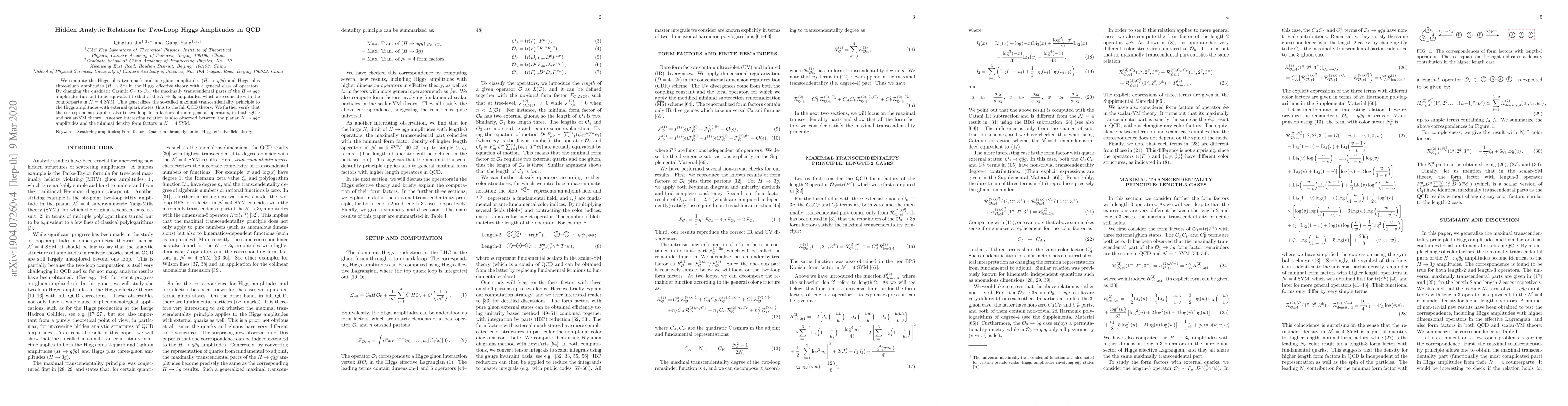 This paper computes two-loop Higgs amplitudes in QCD, revealing hidden analytic relations between Higgs plus two-quark and one-gluon amplitudes and Higgs plus three-gluon amplitudes. The study extends the maximal transcendentality principle to QCD, showing equivalence to ${\cal N}=4$ SYM and identifying additional relations between planar amplitudes and minimal density form factors.