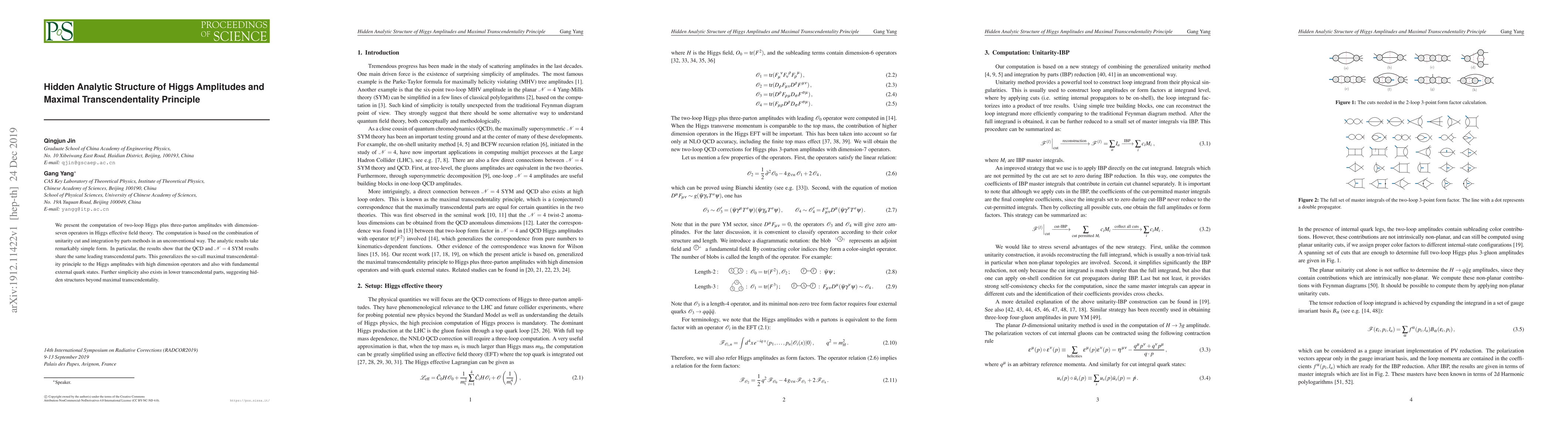 This paper computes two-loop Higgs plus three-parton amplitudes in Higgs effective field theory, revealing a simple analytic structure. The results extend the maximal transcendentality principle, showing shared leading transcendental parts between QCD and N=4 SYM, and suggest hidden analytic structures beyond maximal transcendentality.