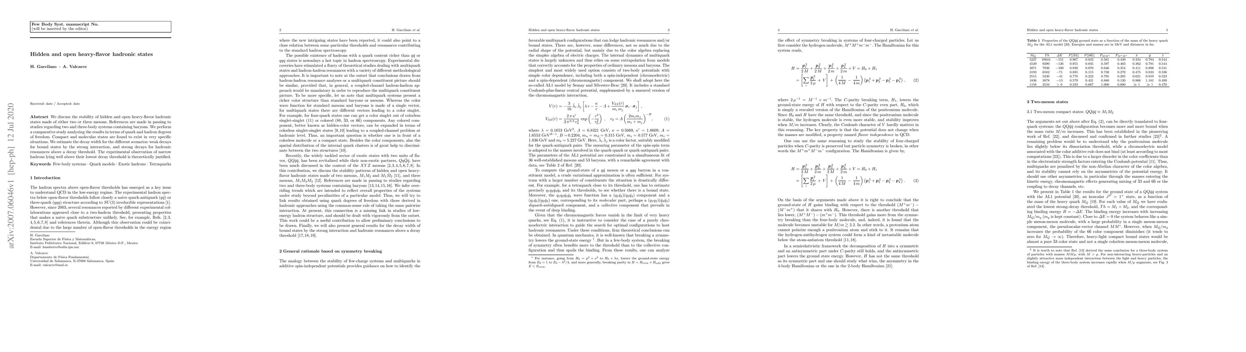 We discuss the stability of hidden and open heavy-flavor hadronic states made of either two or three mesons. References are made in passing to studies regarding two and three-body systems containing baryons. We perform a comparative study analyzing the results in terms of quark and hadron degrees of freedom. Compact and molecular states are found to exist in very specific situations. We estimate the decay width for the different scenarios: weak decays for bound states by the strong interaction, and strong decays for hadronic resonances above a decay threshold. The experimental observation of narrow hadrons lying well above their lowest decay threshold is theoretically justified.
