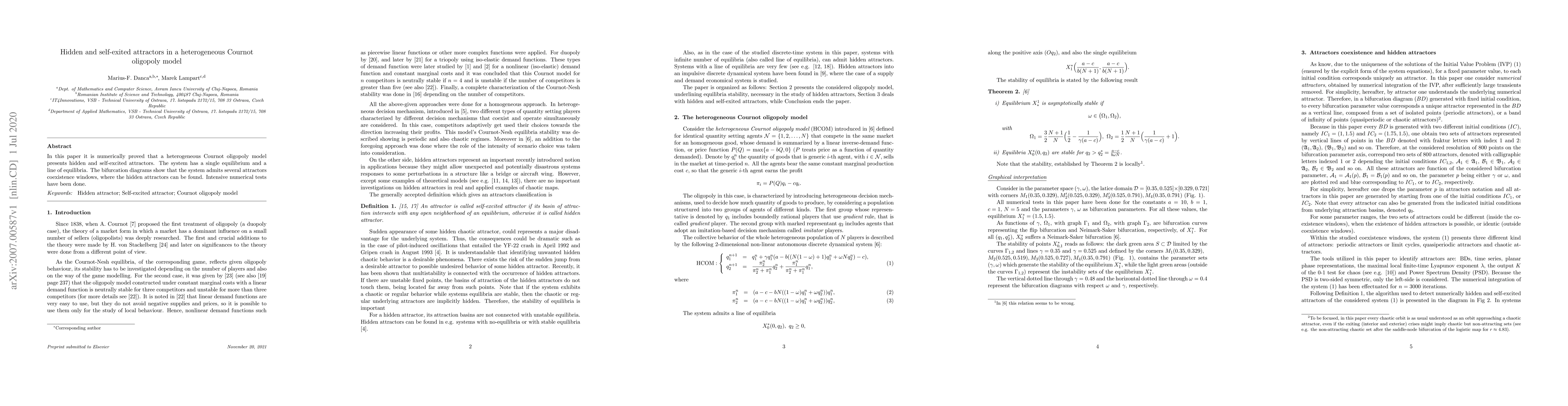In this paper it is numerically proved that a heterogeneous Cournot oligopoly model presents hidden and self-excited attractors. The system has a single equilibrium and a line of equilibria. The bifurcation diagrams show that the system admits several attractors coexistence windows, where the hidden attractors can be found. Intensive numerical tests have been done.