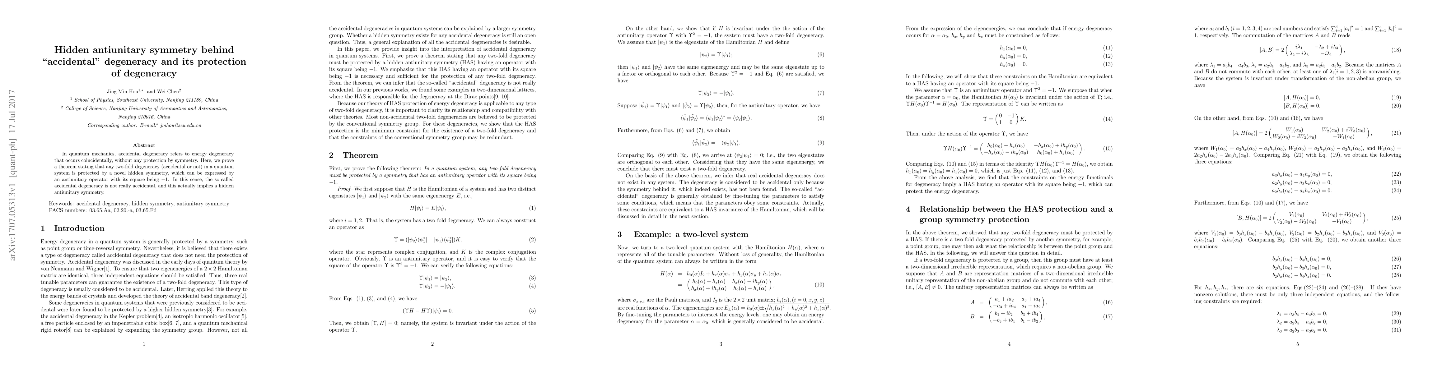 This paper demonstrates that any two-fold degeneracy in quantum systems, termed "accidental," is actually protected by a hidden antiunitary symmetry, challenging the notion that such degeneracies occur without symmetry protection. This finding reveals a fundamental underlying symmetry in quantum mechanics.