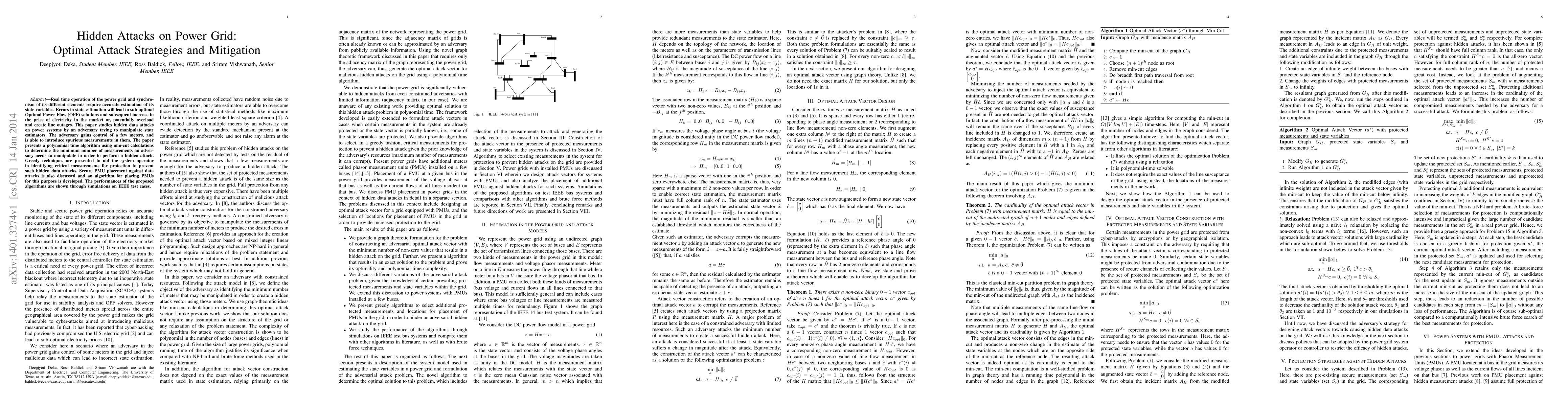 Real time operation of the power grid and synchronism of its different elements require accurate estimation of its state variables. Errors in state estimation will lead to sub-optimal Optimal Power Flow (OPF) solutions and subsequent increase in the price of electricity in the market or, potentially overload and create line outages. This paper studies hidden data attacks on power systems by an adversary trying to manipulate state estimators. The adversary gains control of a few meters, and is able to introduce spurious measurements in them. The paper presents a polynomial time algorithm using min-cut calculations to determine the minimum number of measurements an adversary needs to manipulate in order to perform a hidden attack. Greedy techniques are presented to aid the system operator in identifying critical measurements for protection to prevent such hidden data attacks. Secure PMU placement against data attacks is also discussed and an algorithm for placing PMUs for this purpose is developed. The performances of the proposed algorithms are shown through simulations on IEEE test cases.