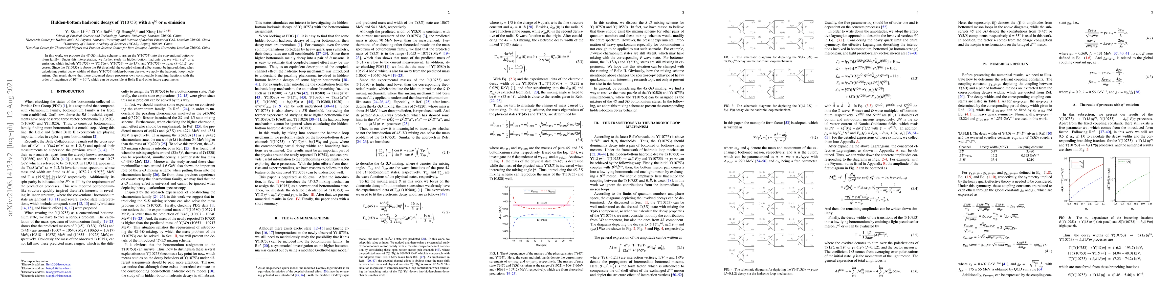 This paper proposes a $4S$-$3D$ mixing scheme to classify the $\Upsilon(10753)$ within the bottomonium family and investigates its hidden-bottom hadronic decays involving $\eta^{(\prime)}$ or $\omega$ emissions. The study finds significant branching fractions for these decays, suggesting they are feasible to detect in future experiments like Belle II.