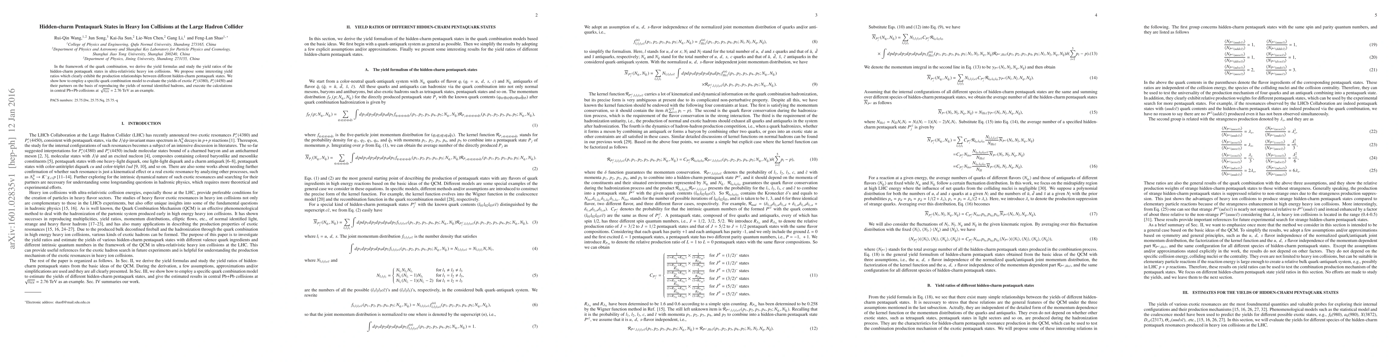 This paper derives yield formulas for hidden-charm pentaquark states in heavy ion collisions, proposing yield ratios that reveal production relationships. It uses a quark combination model to evaluate the yields of exotic $P_c^+$ states in central Pb+Pb collisions at $\sqrt{s_{NN}}= 2.76$ TeV.