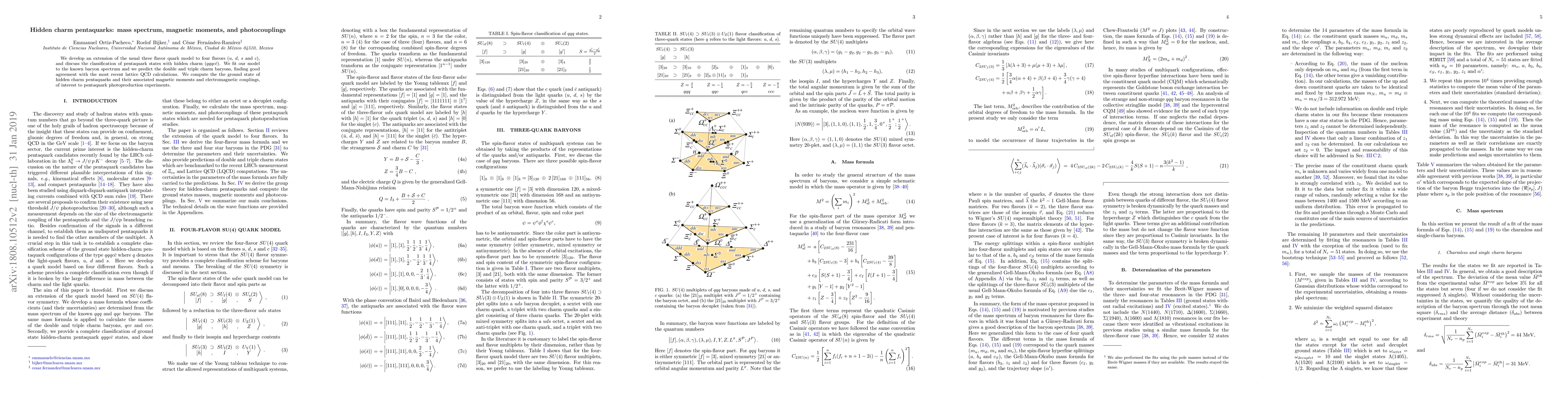 We develop an extension of the usual three flavor quark model to four flavors (u, d, s and c), and discuss the classification of pentaquark states with hidden charm. We fit our model to the known baryon spectrum and we predict the double and triple charm baryons, finding good agreement with the most recent lattice QCD calculations. We compute the the ground state of hidden charm pentaquarks and their associated magnetic moments and electromagnetic couplings, of interest to pentaquark photoproduction experiments.