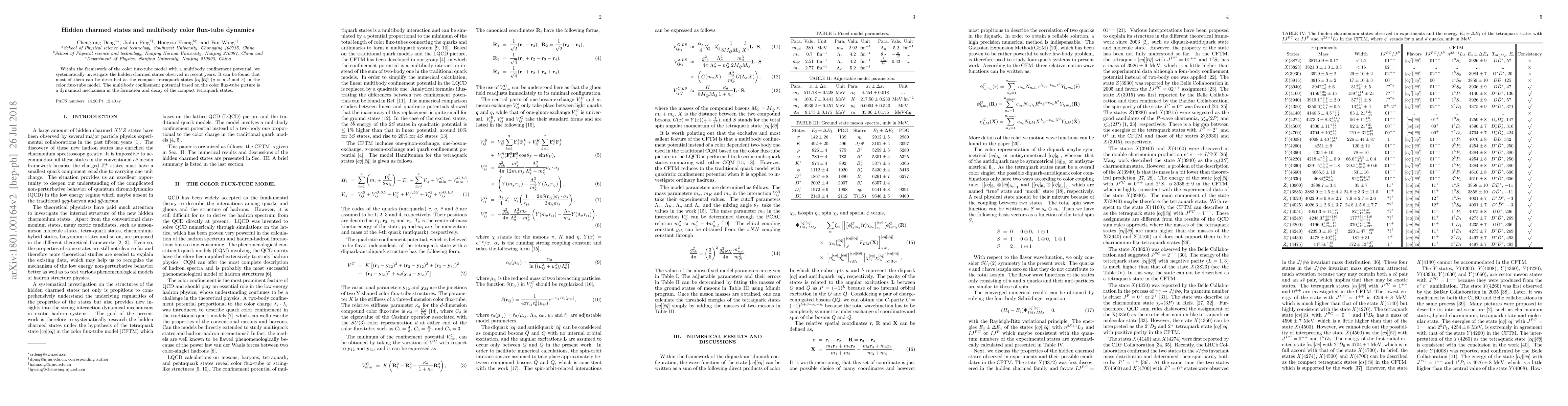 This paper explores hidden charmed states using the color flux-tube model and finds that many observed states can be described as compact tetraquark states. The multibody confinement potential plays a crucial role in the formation and decay of these tetraquark states.