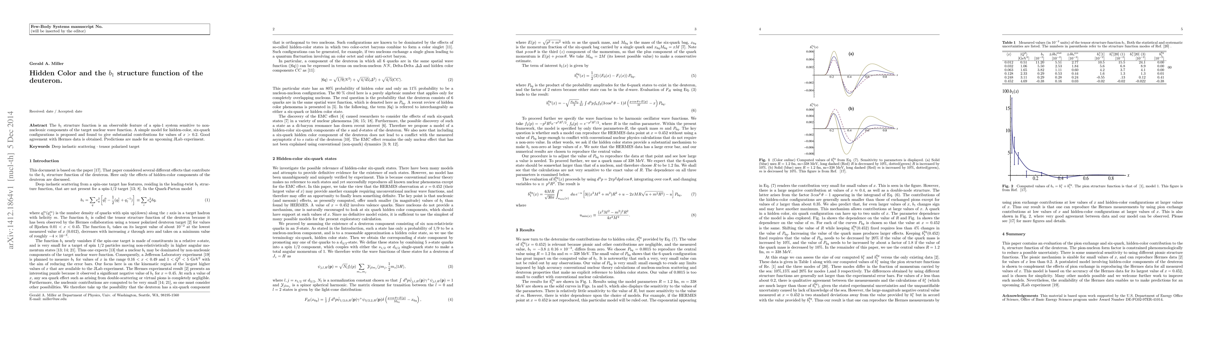The $b_1$ structure function is an observable feature of a spin-1 system sensitive to non-nucleonic components of the target nuclear wave function. A simple model for hidden-color, six-quark configurations is proposed and found to give substantial contributions for values of $ x>0.2$. Good agreement with Hermes data is obtained. Predictions are made for an upcoming JLab experiment.