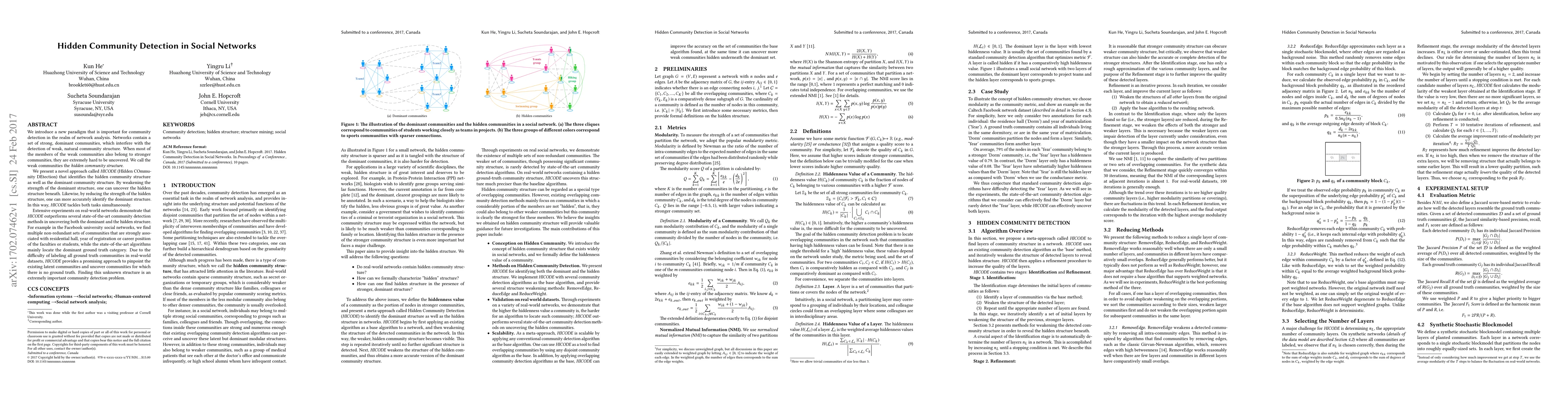 This paper introduces HICODE, a novel method for detecting both dominant and hidden community structures in social networks, addressing the challenge of weak communities overshadowed by stronger ones. Experiments show HICODE outperforms existing methods, revealing latent communities in real-world networks like Facebook university datasets.