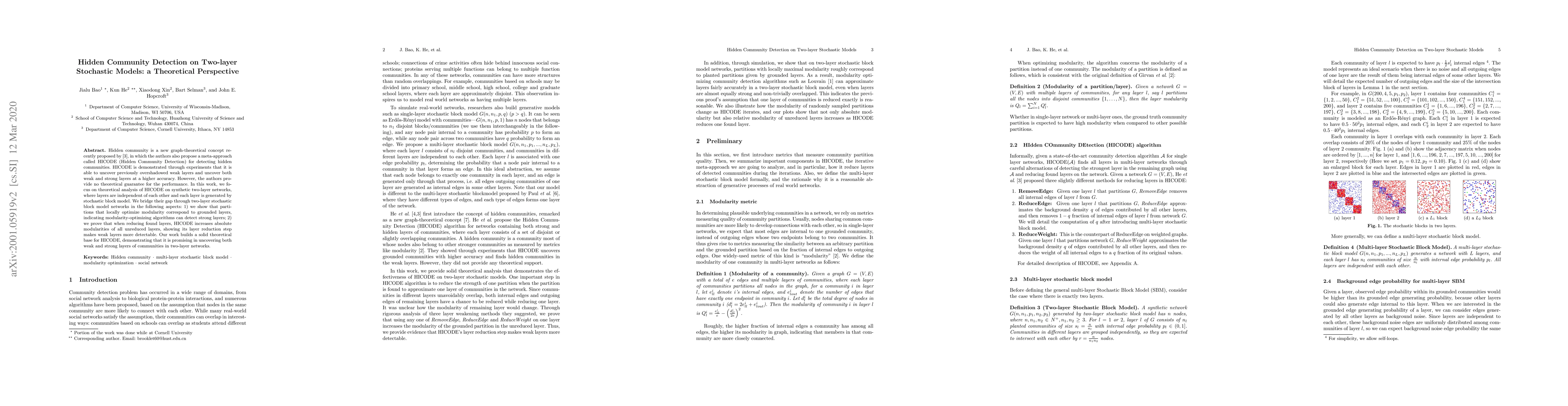 Hidden community is a new graph-theoretical concept recently proposed [4], in which the authors also propose a meta-approach called HICODE (Hidden Community Detection) for detecting hidden communities. HICODE is demonstrated through experiments that it is able to uncover previously overshadowed weak layers and uncover both weak and strong layers at a higher accuracy. However, the authors provide no theoretical guarantee for the performance. In this work, we focus on the theoretical analysis of HICODE on synthetic two-layer networks, where layers are independent of each other and each layer is generated by stochastic block model. We bridge their gap through two-layer stochastic block model networks in the following aspects: 1) we show that partitions that locally optimize modularity correspond to grounded layers, indicating modularity-optimizing algorithms can detect strong layers; 2) we prove that when reducing found layers, HICODE increases absolute modularities of all unreduced layers, showing its layer reduction step makes weak layers more detectable. Our work builds a solid theoretical base for HICODE, demonstrating that it is promising in uncovering both weak and strong layers of communities in two-layer networks.
