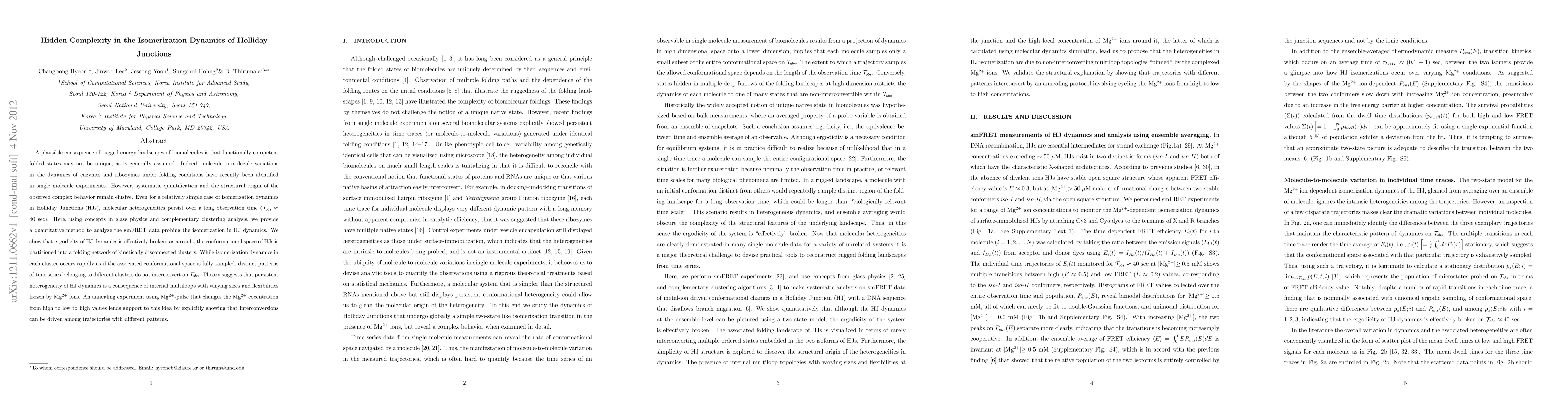 This research investigates the isomerization dynamics of Holliday Junctions (HJs) revealing hidden complexity through ergodicity breakdown and partitioning of conformational space into kinetically disconnected clusters. The study uses smFRET data analysis and annealing experiments to demonstrate that persistent heterogeneity in HJ dynamics arises from internal multiloops influenced by Mg2+ ions.