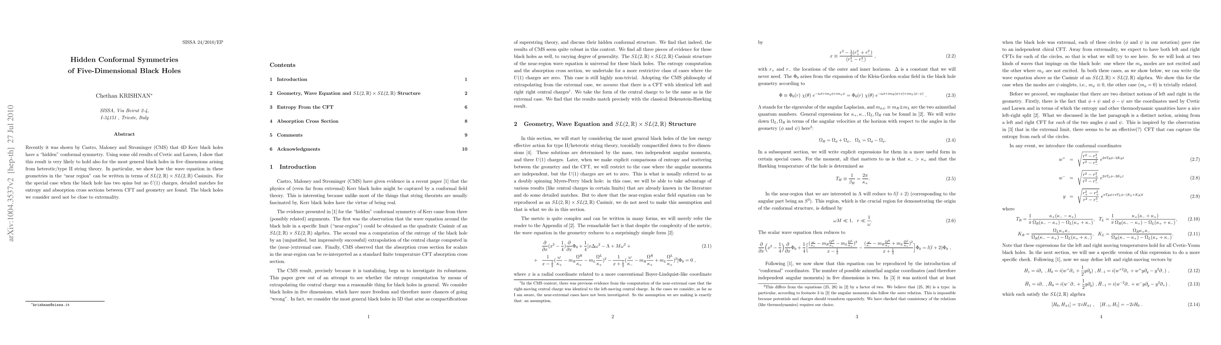 This paper extends the concept of "hidden" conformal symmetry, initially discovered in 4D Kerr black holes, to five-dimensional black holes from heterotic/type II string theory. It demonstrates that the wave equation in the near region of these black holes can be expressed using SL(2,R) X SL(2,R) Casimirs, with detailed matches for entropy and absorption cross sections for non-charged black holes with two spins.