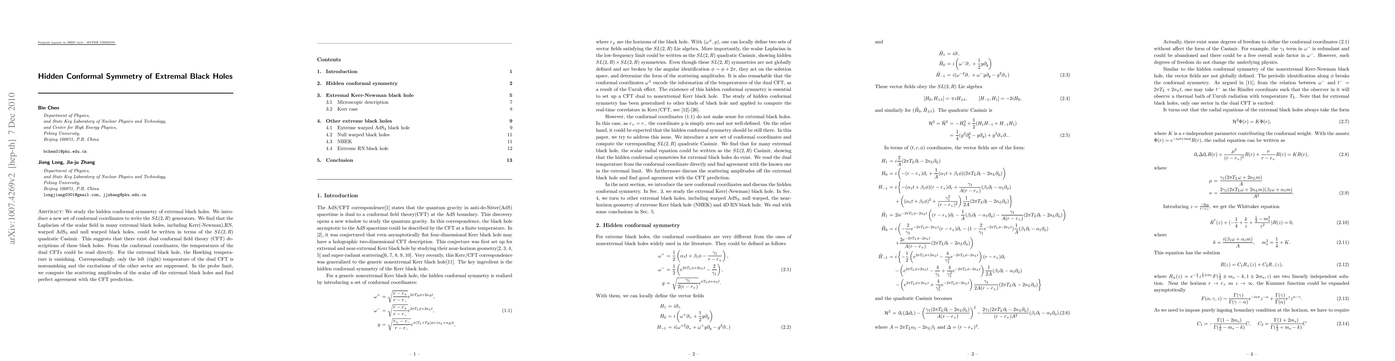 This paper explores the hidden conformal symmetry in extremal black holes, introducing new conformal coordinates that reveal an $SL(2,R)$ structure. It finds that the Laplacian of the scalar field can be expressed using the $SL(2,R)$ quadratic Casimir, indicating dual CFT descriptions, with only one sector's temperature remaining non-zero due to the vanishing Hawking temperature.
