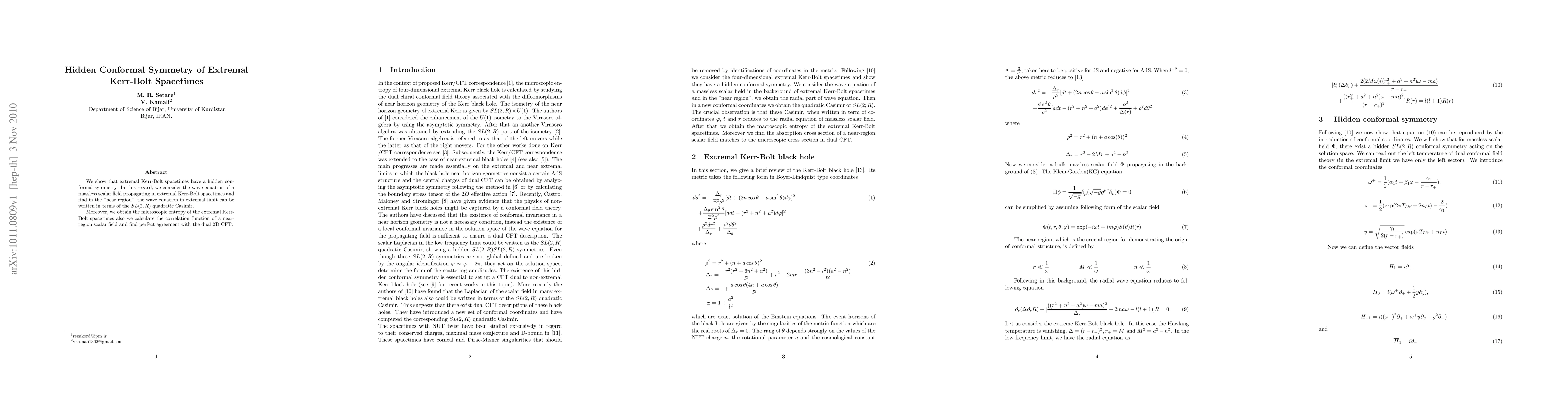 Summary: This paper reveals a hidden conformal symmetry in extremal Kerr-Bolt spacetimes, demonstrating that the wave equation in the near region can be expressed using the $SL(2,R)$ quadratic Casimir. It also calculates the microscopic entropy and confirms agreement with a dual 2D conformal field theory.