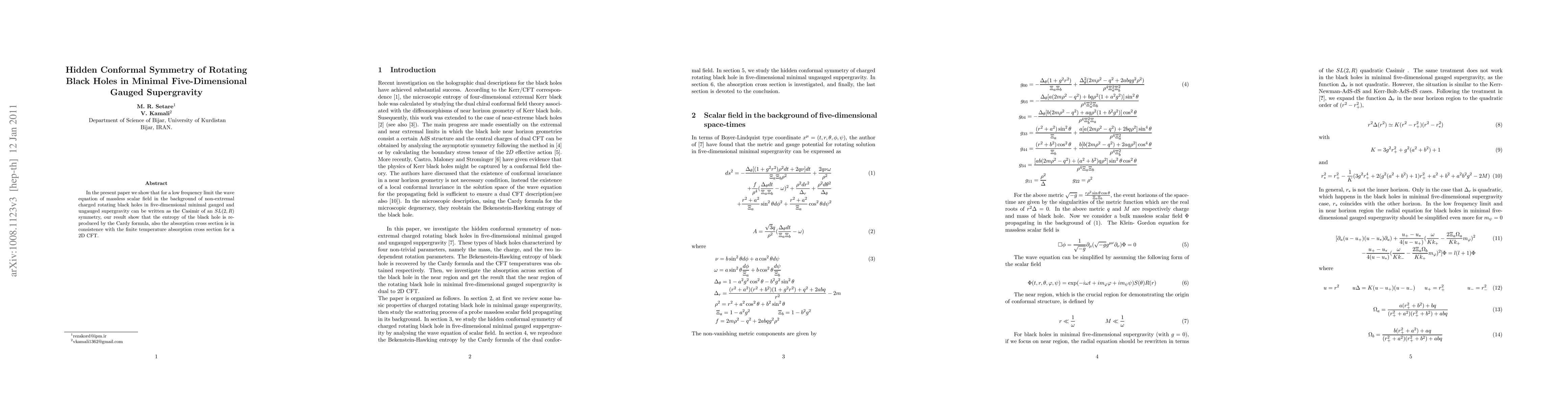 This paper demonstrates that massless scalar fields around rotating black holes in five-dimensional supergravity exhibit a hidden conformal symmetry in the low frequency limit, expressed as an $SL(2,R)$ Casimir. The findings suggest that the black hole entropy aligns with the Cardy formula and absorption cross sections match those expected for a two-dimensional conformal field theory at finite temperature.