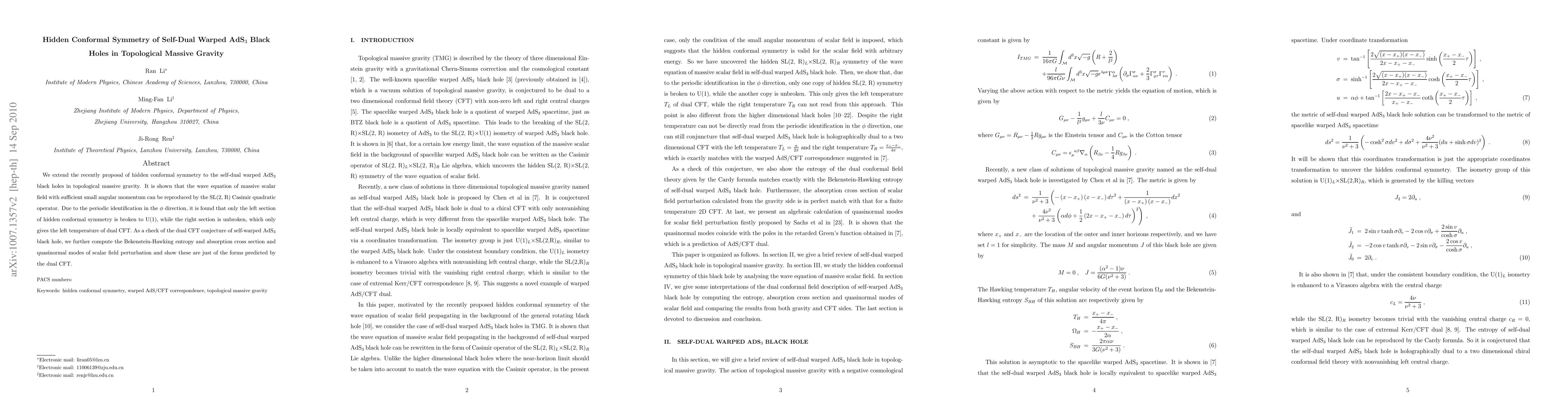 We extend the recently proposal of hidden conformal symmetry to the self-dual warped AdS$_3$ black holes in topological massive gravity. It is shown that the wave equation of massive scalar field with sufficient small angular momentum can be reproduced by the SL(2, R) Casimir quadratic operator. Due to the periodic identification in the $\phi$ direction, it is found that only the left section of hidden conformal symmetry is broken to U(1), while the right section is unbroken, which only gives the left temperature of dual CFT. As a check of the dual CFT conjecture of self-warped AdS$_3$ black hole, we further compute the Bekenstein-Hawking entropy and absorption cross section and quasinormal modes of scalar field perturbation and show these are just of the forms predicted by the dual CFT.
