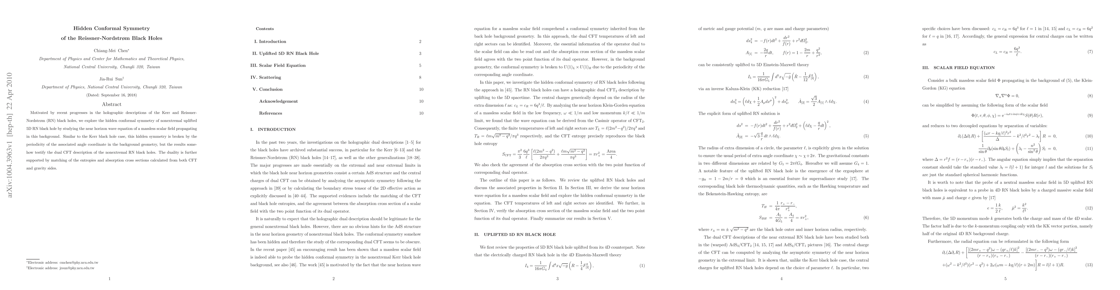 This paper investigates the hidden conformal symmetry in the 5D Reissner-Nordström (RN) black hole, revealing its dual conformal field theory (CFT) description through the near-horizon wave equation of a massless scalar field. The symmetry is broken by the angle coordinate's periodicity, yet the results align with the dual CFT interpretation, supported by matching entropy and absorption cross-section calculations.