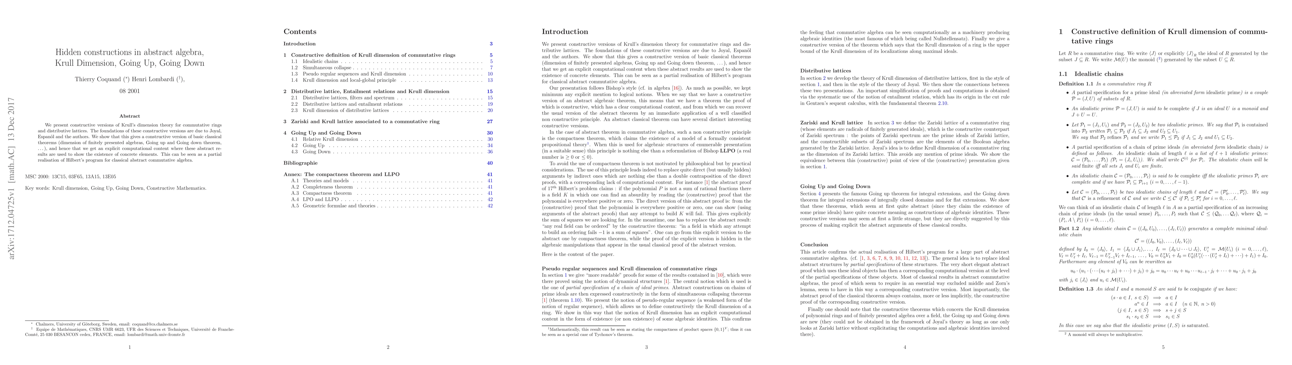 This paper develops constructive versions of Krull's dimension theory for commutative rings and distributive lattices, providing explicit computational content for classical theorems like Going Up and Going Down. This work realizes a part of Hilbert's program by demonstrating the existence of concrete elements through abstract results.