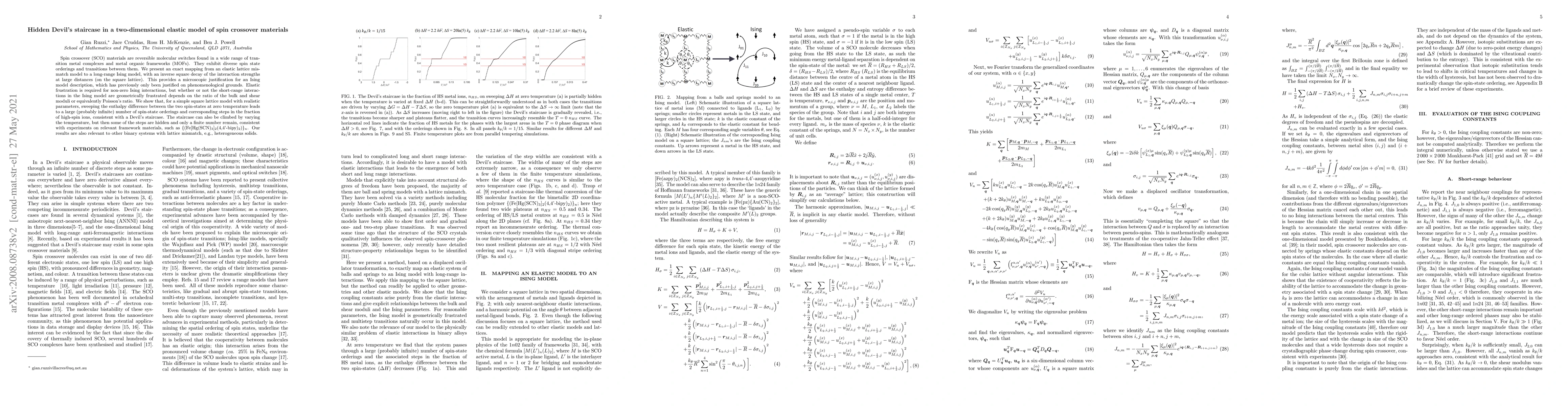 Spin crossover (SCO) materials are reversible molecular switches found in a wide range of transition metal complexes and metal organic frameworks (MOFs). They exhibit diverse spin state orderings and transitions between them. We present an exact mapping from an elastic lattice mismatch model to a long-range Ising model, with an inverse square decay of the interaction strengths at large distances (on the square lattice). This provides a microscopic justification for an Ising model description, which has previously only been justified on phenomenological grounds. Elastic frustration is required for non-zero Ising interactions, but whether or not the short-range interactions in the Ising model are geometrically frustrated depends on the ratio of the bulk and shear moduli or equivalently Poisson's ratio. We show that, for a simple square lattice model with realistic parameters, sweeping the enthalpy difference between the two spin-states at zero temperature leads to a large (probably infinite) number of spin-state orderings and corresponding steps in the fraction of high-spin ions, consistent with a Devil's staircase. The staircase can also be climbed by varying the temperature, but then some of the steps are hidden and only a finite number remain, consistent with experiments on relevant framework materials, such as {(Fe[Hg(SCN)$_3$]$_2$(4,4'-bipy)$_2$)}$_n$. Our results are also relevant to other binary systems with lattice mismatch, e.g., heterogeneous solids.