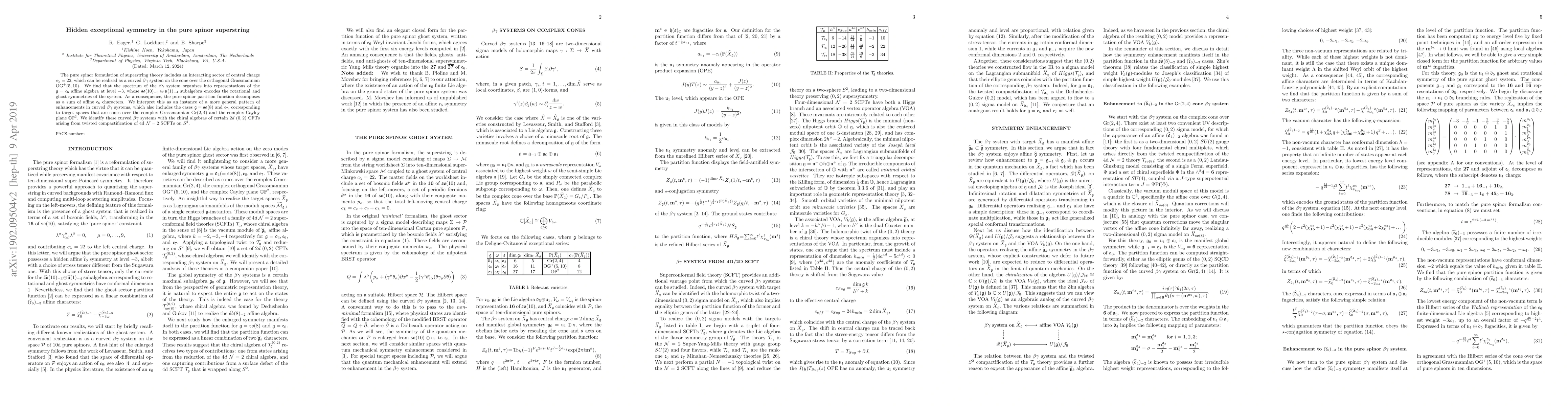 The pure spinor superstring formulation exhibits hidden exceptional symmetry as a curved beta-gamma system that decomposes into representations of the E6 affine algebra, leading to a partition function decomposition into affine E6 characters.