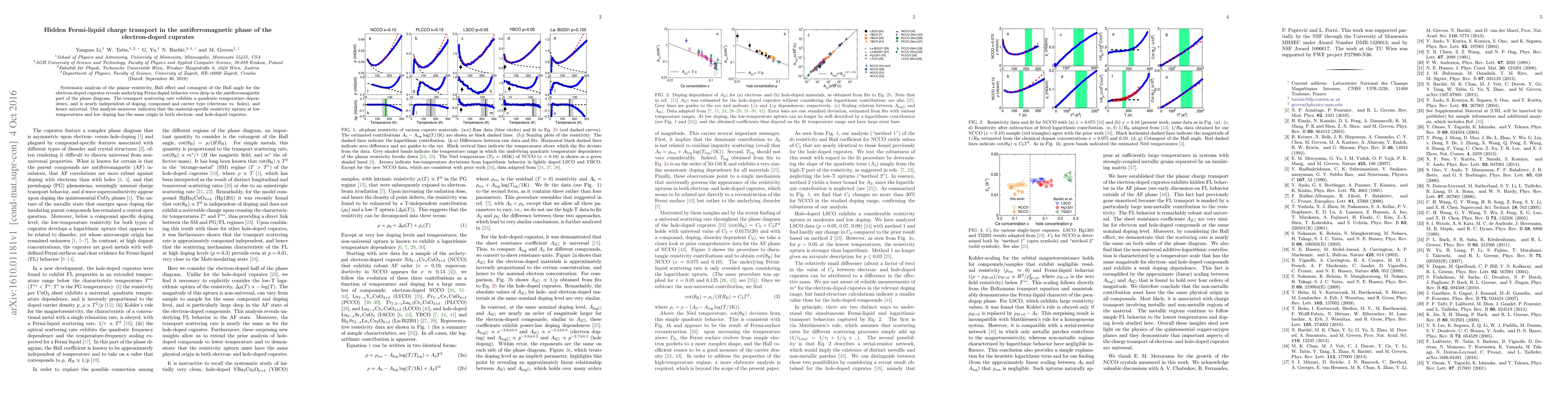 This paper uncovers hidden Fermi-liquid charge transport in electron-doped cuprates, showing universal quadratic temperature dependence in the antiferromagnetic phase. The study finds a common origin for the low-temperature resistivity upturn in both electron- and hole-doped cuprates.