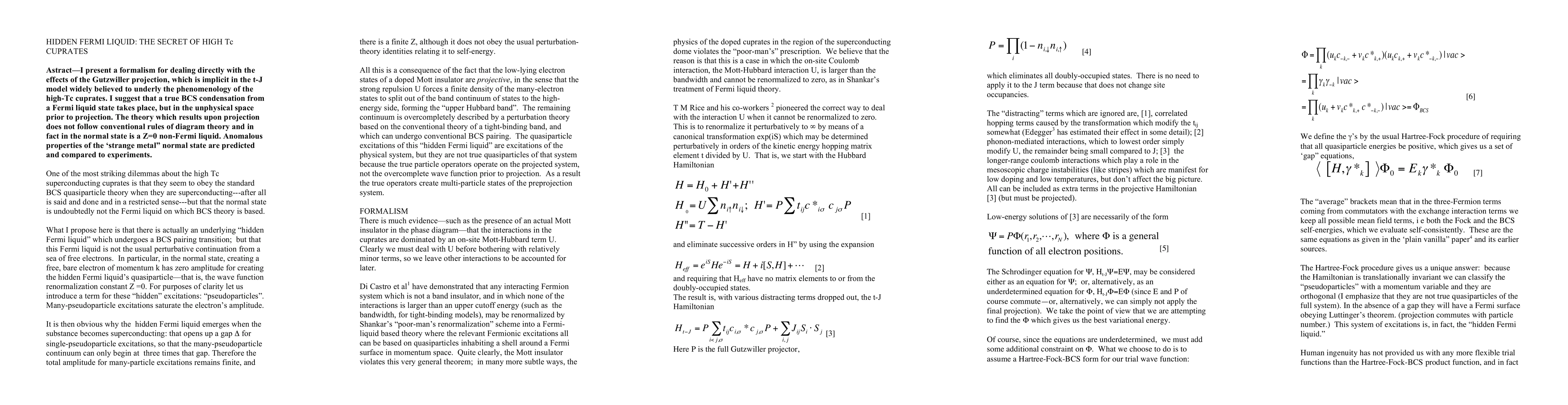 I present a formalism for dealing directly with the effects of the Gutzwiller projection, which is implicit in the t-J model widely believed to underly the phenomenology of the high-Tc cuprates. I suggest that a true BCS condensation from a Fermi liquid state takes place, but in the unphysical space prior to projection. The theory which results upon projection does not follow conventional rules of diagram theory and in fact in the normal state is a Z=0 non-Fermi liquid. Anomalous properties of this strange metal normal state are predicted and compared to experiments.