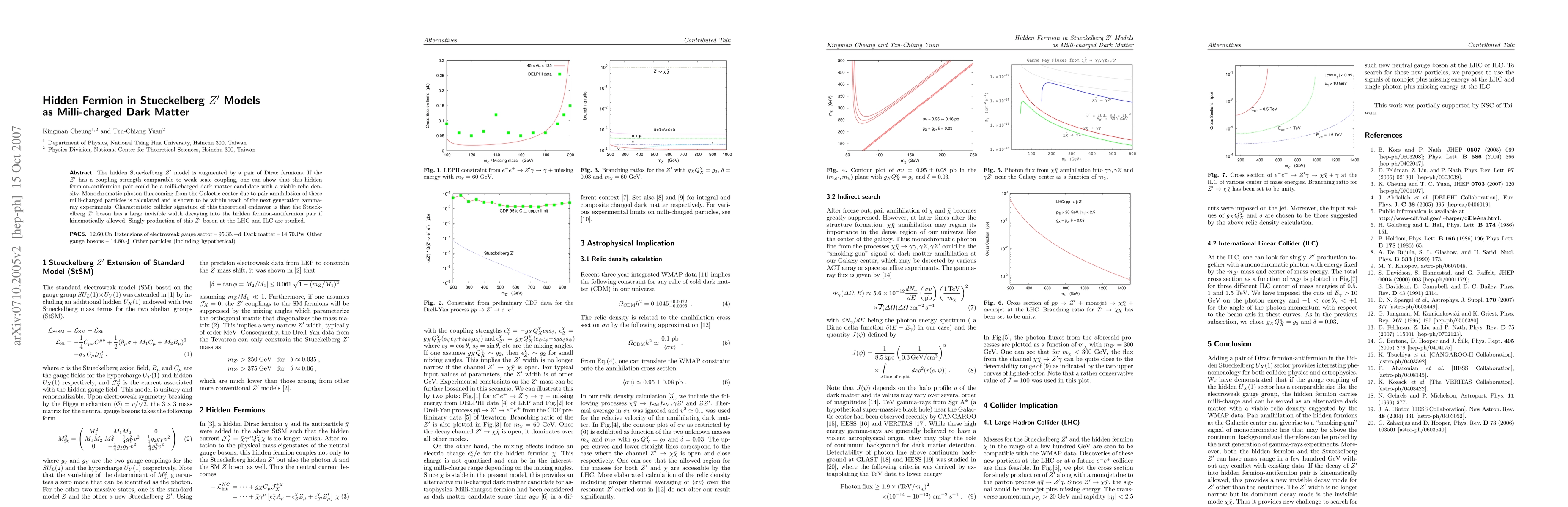 The hidden Stueckelberg Z' model is augmented by a pair of Dirac fermions. If the Z' has a coupling strength comparable to weak scale coupling, one can show that this hidden fermion-antifermion pair could be a milli-charged dark matter candidate with a viable relic density. Monochromatic photon flux coming from the Galactic center due to pair annihilation of these milli-charged particles is calculated and is shown to be within reach of the next generation gamma-ray experiments. Characteristic collider signature of this theoretical endeavor is that the Stueckelberg Z' boson has a large invisible width decaying into the hidden fermion-antifermion pair if kinematically allowed. Singly production of this Z' boson at the LHC and ILC are studied.