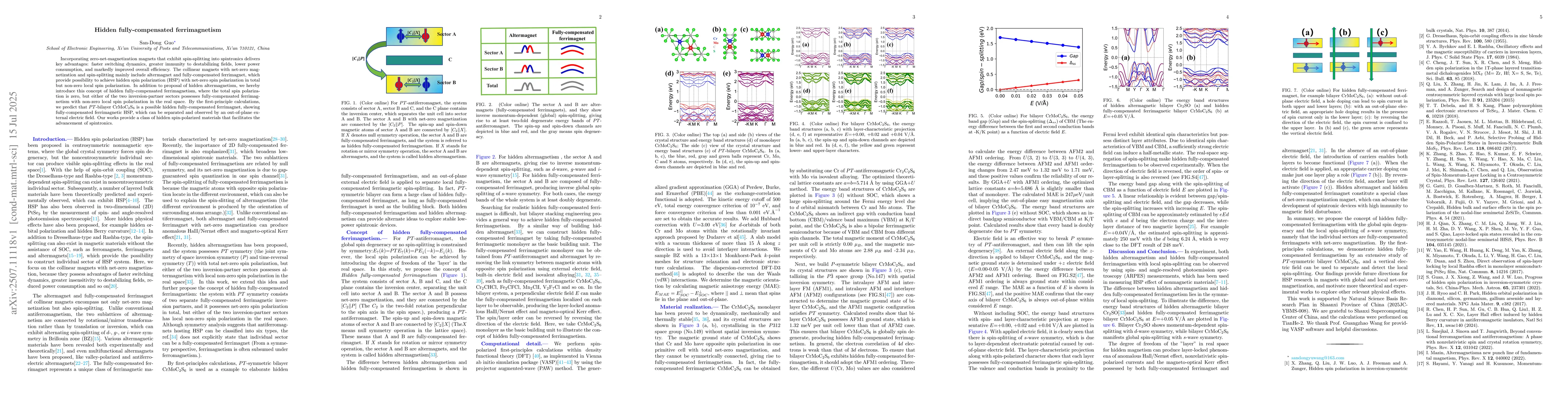 Incorporating zero-net-magnetization magnets that exhibit spin-splitting into spintronics delivers key advantages: faster switching dynamics, greater immunity to destabilizing fields, lower power consumption, and markedly improved overall efficiency. The collinear magnets with net-zero magnetization and spin-splitting mainly include altermagnet and fully-compensated ferrimagnet, which provide possibility to achieve hidden spin polarization (HSP) with net-zero spin polarization in total but non-zero local spin polarization. In addition to proposal of hidden altermagnetism, we hereby introduce this concept of hidden fully-compensated ferrimagnetism, where the total spin polarization is zero, but either of the two inversion-partner sectors possesses fully-compensated ferrimagnetism with non-zero local spin polarization in the real space. By the first-principle calculations, we predict that $PT$-bilayer $\mathrm{CrMoC_2S_6}$ is a possible hidden fully-compensated ferrimagnet, showing fully-compensated ferrimagnetic HSP, which can be separated and observed by an out-of-plane external electric field. Our works provide a class of hidden spin-polarized materials that facilitates the advancement of spintronics.