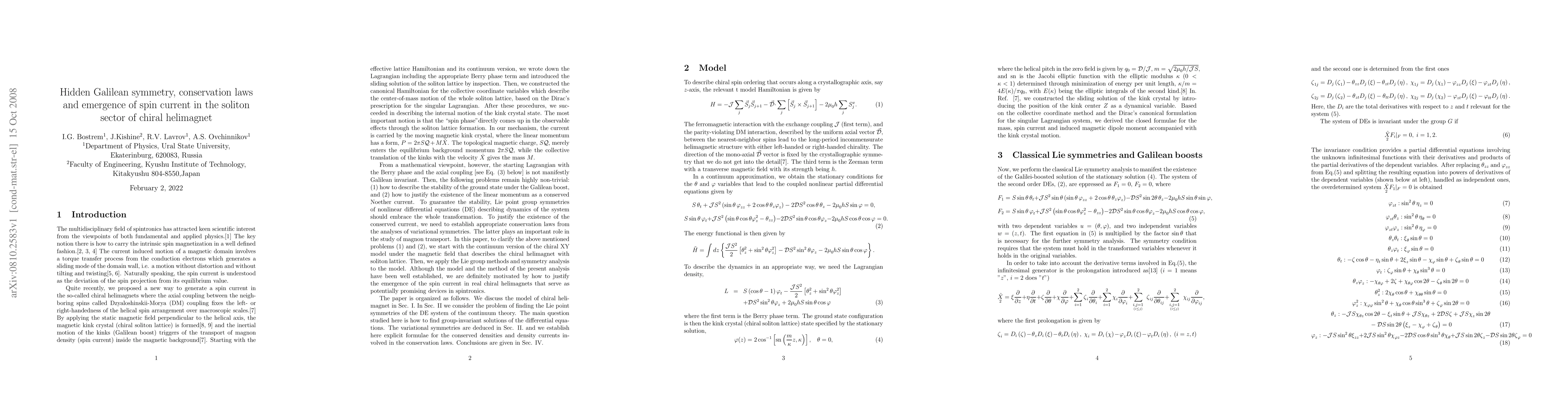 This paper explores the hidden Galilean symmetry in the chiral XY model of helimagnets under a magnetic field, revealing Lie point symmetries and invariant solutions. It establishes conservation laws linked to the transport spin current, demonstrating its emergence in the soliton sector.
