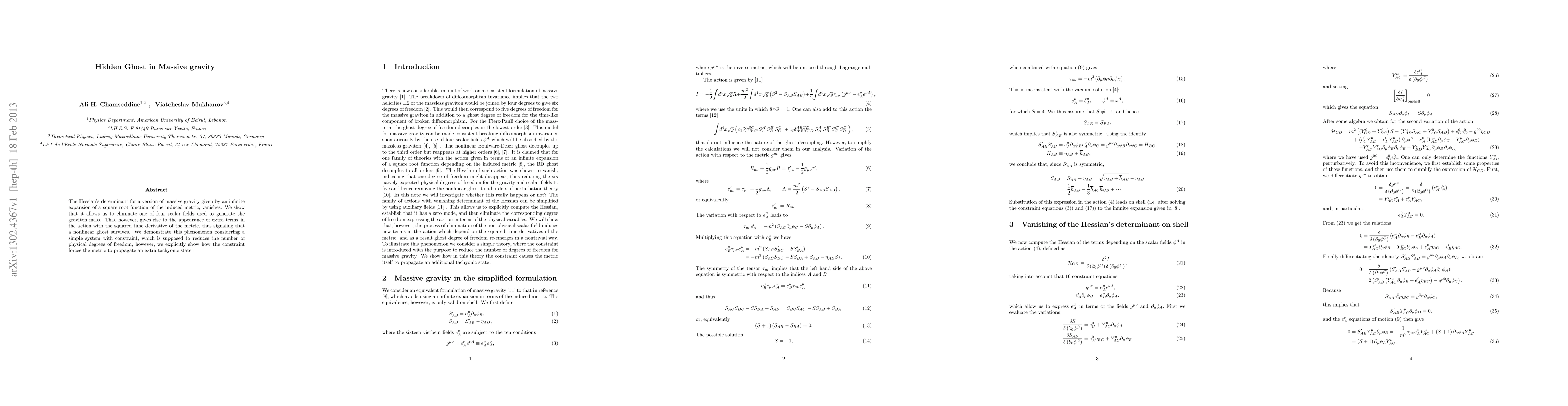 The Hessian's determinant for a version of massive gravity given by an infinite expansion of a square root function of the induced metric, vanishes. We show that it allows us to eliminate one of four scalar fields used to generate the graviton mass. This, however, gives rise to the appearance of extra terms in the action with the squared time derivative of the metric, thus signaling that a nonlinear ghost survives.We demonstrate this phenomenon considering a simple system with constraint, which is supposed to reduces the number of physical degrees of freedom, however, we explicitly show how the constraint forces the metric to propagate an extra tachyonic state.