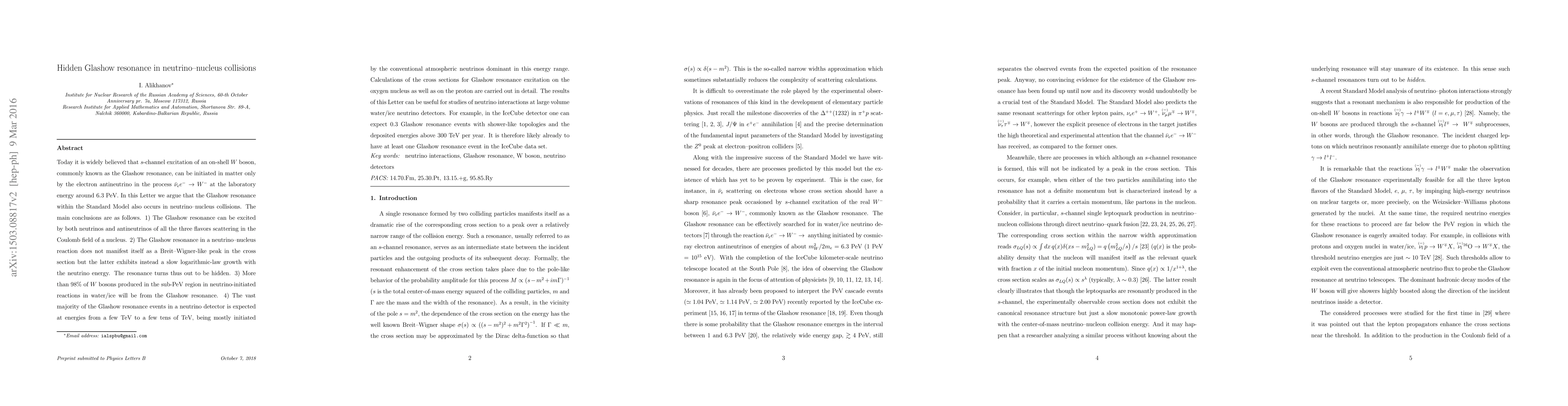 Today it is widely believed that $s$-channel excitation of an on-shell~$W$ boson, commonly known as the Glashow resonance, can be initiated in matter only by the electron antineutrino in the process $\bar\nu_ee^-\rightarrow W^-$ at the laboratory energy around~6.3~PeV. In this paper we argue that the Glashow resonance within the Standard Model also occurs in neutrino--nucleus collisions. The main conclusions are as follows. 1)~The Glashow resonance can be excited by both~neutrinos and~antineutrinos of all the three flavors scattering in the Coulomb field of a nucleus. 2)~The Glashow resonance in a neutrino--nucleus reaction does not manifest itself as a Breit--Wigner-like peak in the cross section but the latter exhibits instead a slow logarithmic-law growth with the neutrino energy. The resonance turns thus out to be hidden. 3)~More than~$98\%$ of~$W$ bosons produced in the sub-PeV region in neutrino-initiated reactions in water/ice will be from the Glashow resonance. 4)~The vast majority of the Glashow resonance events in a neutrino detector is expected at energies from a few TeV to a few tens of TeV, being mostly initiated by the conventional atmospheric neutrinos dominant in this energy range. Calculations of the cross sections for Glashow resonance excitation on the oxygen nucleus as well as on the proton are carried out in detail. The results of this paper can be useful for studies of neutrino interactions at large volume water/ice neutrino detectors. For example, in the IceCube detector one can expect~0.3 Glashow resonance events with shower-like topologies and the deposited energies above~$300~\text{TeV}$ per year. It is therefore likely already to have at least one Glashow resonance event in the IceCube data set.