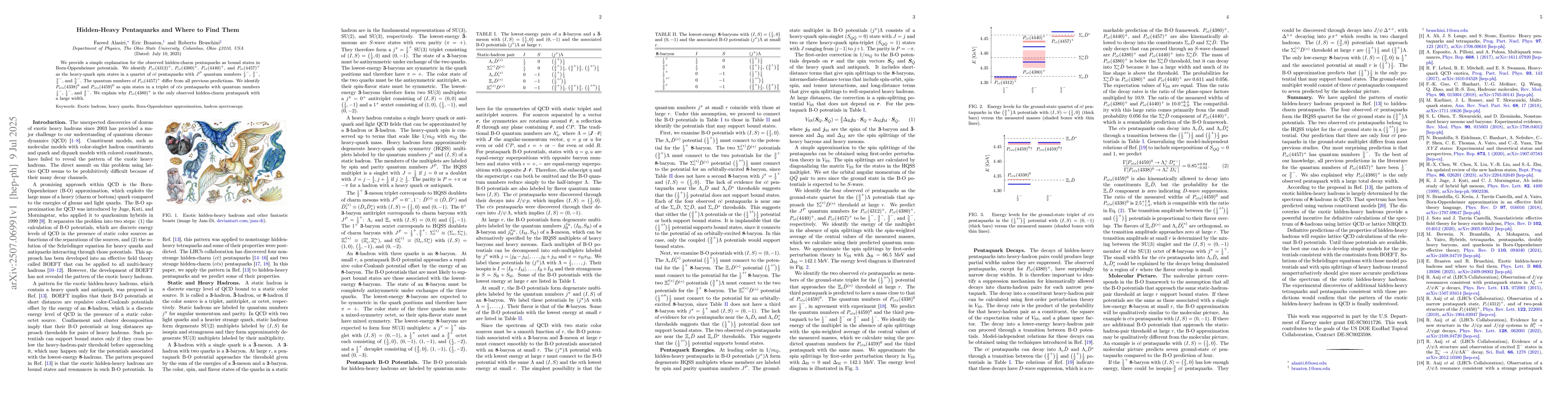 We provide a simple explanation for the observed hidden-charm pentaquarks as bound states in Born-Oppenheimer potentials. We identify $P_{c\bar{c}}(4312)^+$, $P_{c\bar{c}}(4380)^+$, $P_{c\bar{c}}(4440)^+$, and $P_{c\bar{c}}(4457)^+$ as the heavy-quark spin states in a quartet of $c \bar{c}$ pentaquarks with $J^P$ quantum numbers $\frac{1}{2}^-$, $\frac{3}{2}^-$, $\frac{3}{2}^-$, and $\frac{5}{2}^-$. The quantum numbers of $P_{c\bar{c}}(4457)^+$ differ from all previous predictions. We identify $P_{c\bar{c}s}(4338)^0$ and $P_{c\bar{c}s}(4459)^0$ as spin states in a triplet of $c \bar{c}s$ pentaquarks with quantum numbers $\frac{1}{2}^-$, $\frac{1}{2}^-$, and $\frac{3}{2}^-$. We explain why $P_{c\bar{c}}(4380)^+$ is the only observed hidden-charm pentaquark with a large width.