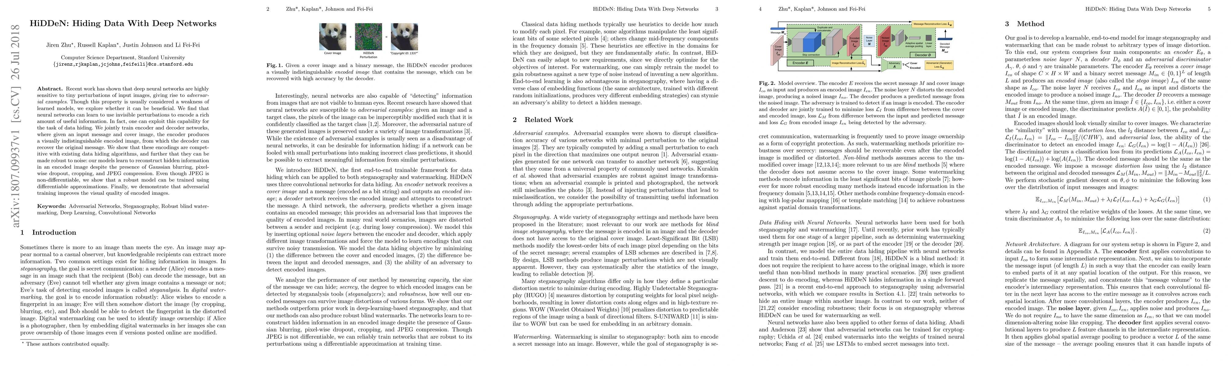 Recent work has shown that deep neural networks are highly sensitive to tiny perturbations of input images, giving rise to adversarial examples. Though this property is usually considered a weakness of learned models, we explore whether it can be beneficial. We find that neural networks can learn to use invisible perturbations to encode a rich amount of useful information. In fact, one can exploit this capability for the task of data hiding. We jointly train encoder and decoder networks, where given an input message and cover image, the encoder produces a visually indistinguishable encoded image, from which the decoder can recover the original message. We show that these encodings are competitive with existing data hiding algorithms, and further that they can be made robust to noise: our models learn to reconstruct hidden information in an encoded image despite the presence of Gaussian blurring, pixel-wise dropout, cropping, and JPEG compression. Even though JPEG is non-differentiable, we show that a robust model can be trained using differentiable approximations. Finally, we demonstrate that adversarial training improves the visual quality of encoded images.