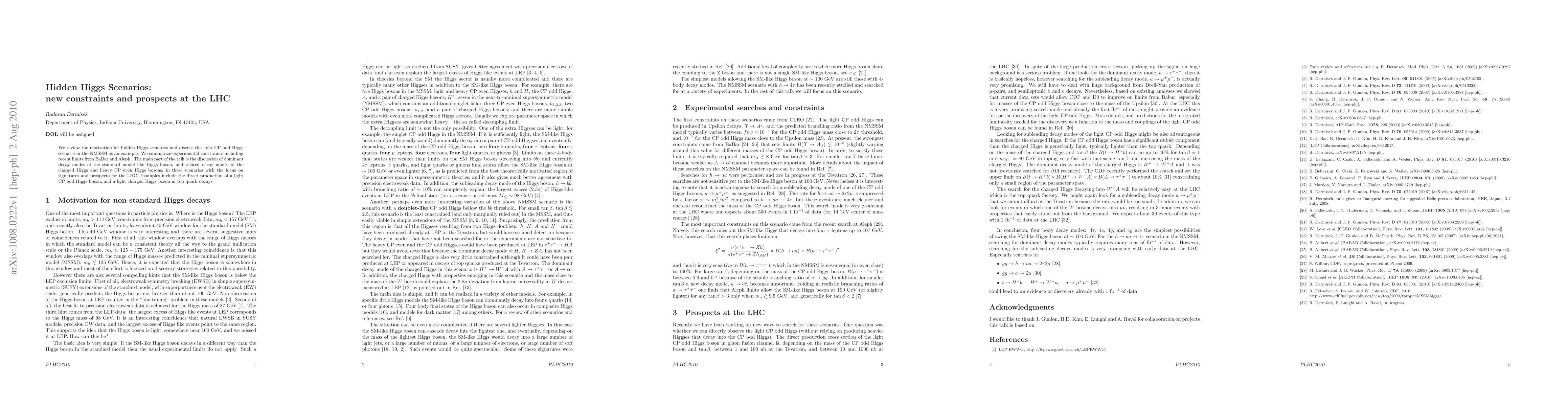 This paper reviews hidden Higgs scenarios, particularly focusing on the light CP odd Higgs in the NMSSM, and discusses experimental constraints from BaBar and Aleph. It highlights LHC prospects for detecting these particles, emphasizing decay modes and signatures, including direct production of light CP odd and charged Higgs bosons.
