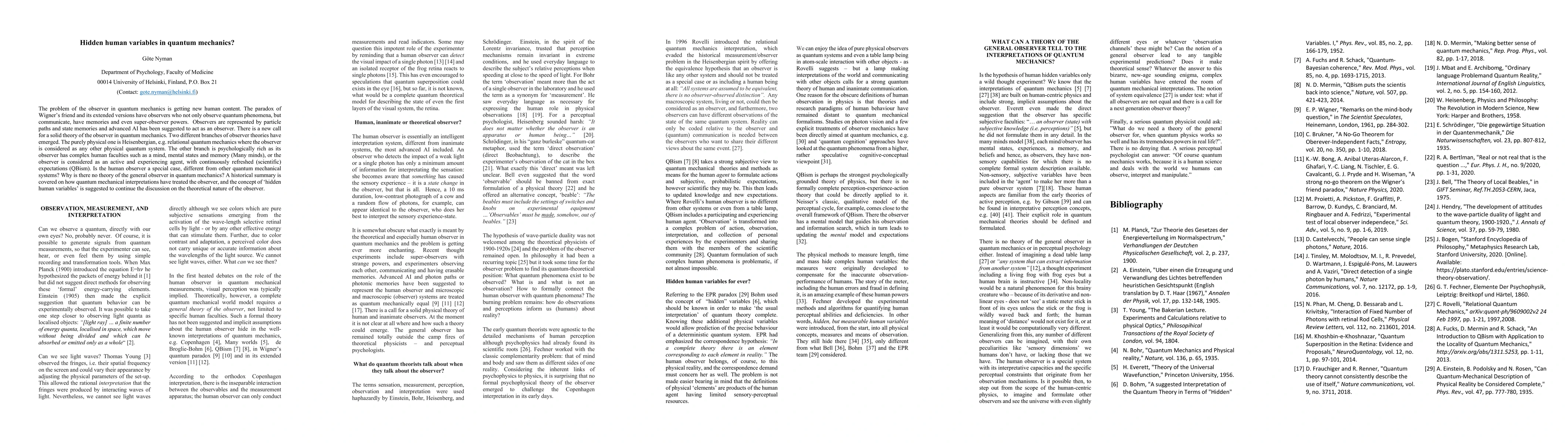This paper explores the evolving role of the observer in quantum mechanics, highlighting the paradox of Wigner's friend and the emergence of theories that attribute complex human faculties to observers. It discusses the need for a comprehensive theory of the observer, contrasting physical interpretations with psychologically rich approaches, and suggests the concept of hidden human variables to advance the discourse on the observer's theoretical nature.