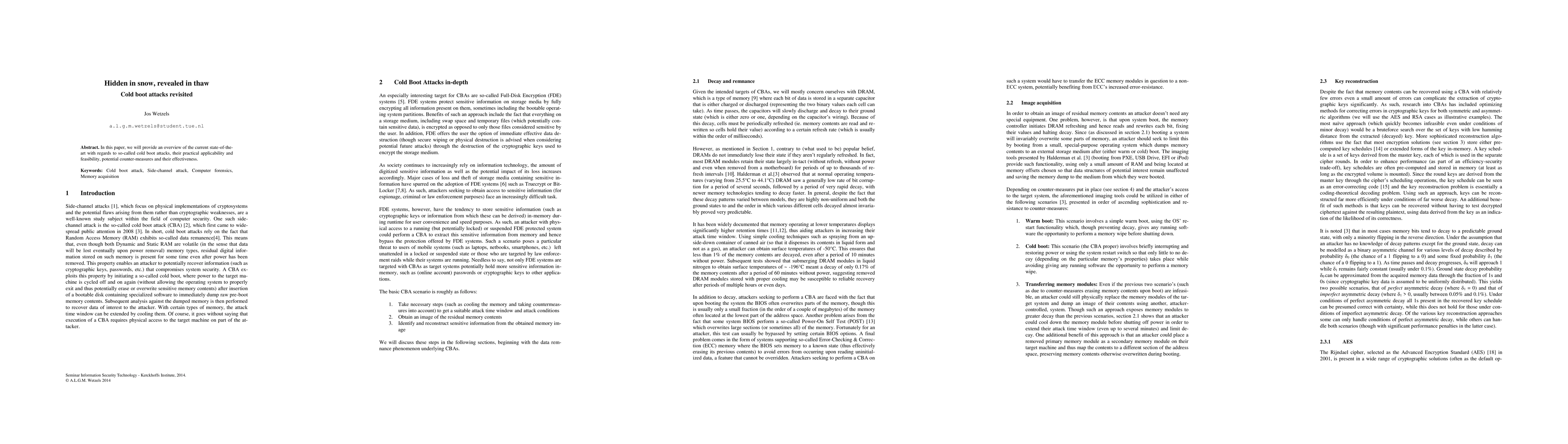 Summary: This paper reviews the latest advancements in cold boot attacks, assessing their practical viability and effectiveness, alongside exploring potential countermeasures to mitigate these security threats.