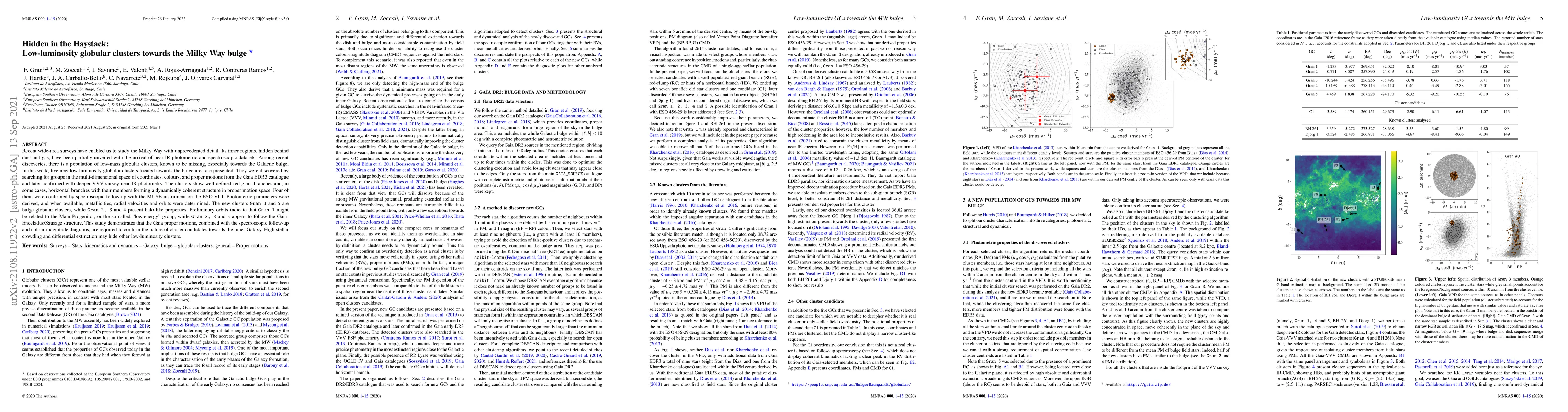Recent wide-area surveys have enabled us to study the Milky Way with unprecedented detail. Its inner regions, hidden behind dust and gas, have been partially unveiled with the arrival of near-IR photometric and spectroscopic datasets. Among recent discoveries, there is a population of low-mass globular clusters, known to be missing, especially towards the Galactic bulge. In this work, five new low-luminosity globular clusters located towards the bulge area are presented. They were discovered by searching for groups in the multi-dimensional space of coordinates, colours, and proper motions from the Gaia EDR3 catalogue and later confirmed with deeper VVV survey near-IR photometry. The clusters show well-defined red-giant branches and, in some cases, horizontal branches with their members forming a dynamically coherent structure in proper motion space. Four of them were confirmed by spectroscopic follow-up with the MUSE instrument on the ESO VLT. Photometric parameters were derived, and when available, metallicities, radial velocities and orbits were determined. The new clusters Gran 1 and 5 are bulge globular clusters, while Gran 2, 3, and 4 present halo-like properties. Preliminary orbits indicate that Gran 1 might be related to the Main Progenitor, or the so-called ''low-energy'' group, while Gran 2, 3 and 5 appear to follow the Gaia-Enceladus-Sausage. This study demonstrates that the Gaia proper motions, combined with the spectroscopic follow-up and colour-magnitude diagrams, are required to confirm the nature of cluster candidates towards the inner Galaxy. High stellar crowding and differential extinction may hide other low-luminosity clusters.
