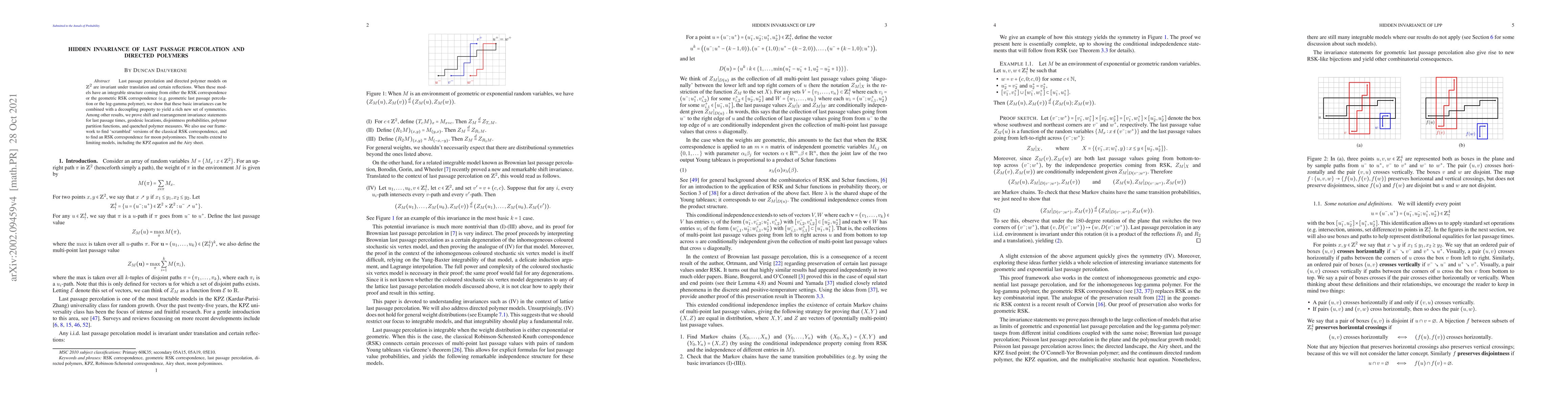 This paper demonstrates new symmetries in last passage percolation and directed polymer models, revealing shift and rearrangement invariances for various quantities. It extends the classical RSK correspondence to more complex structures and applies these findings to limiting models like the KPZ equation and the Airy sheet.