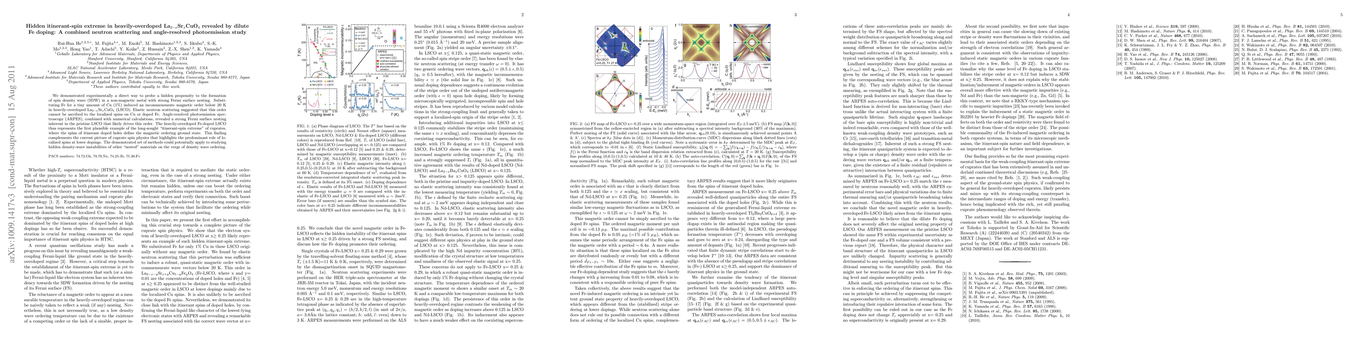 This study reveals an itinerant-spin phase in heavily-overdoped La2-xSrxCuO4 through dilute Fe doping, showing an incommensurate magnetic order via neutron scattering and ARPES. The findings suggest a strong Fermi surface nesting driving this order, marking the first example of the "itinerant-spin extreme" in cuprates.