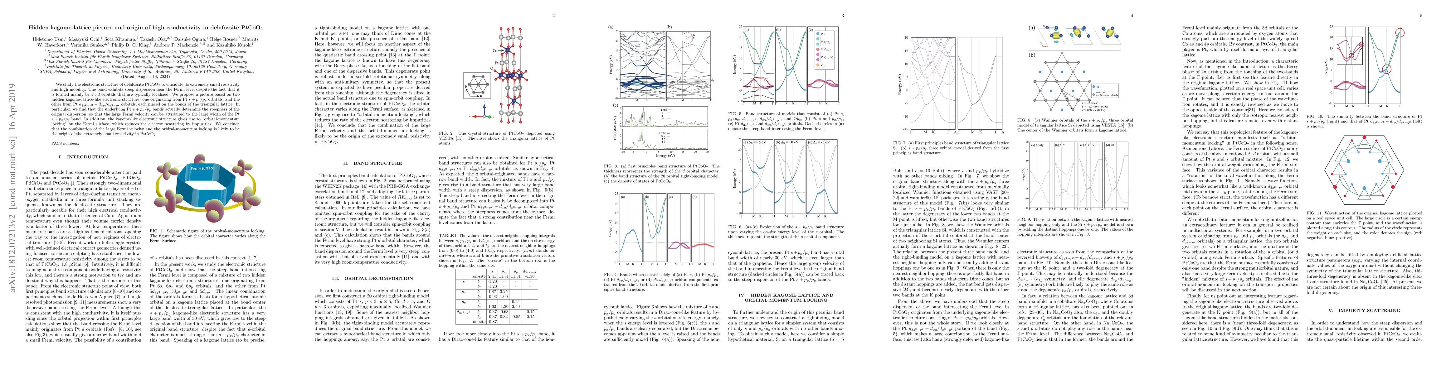 We study the electronic structure of delafossite PtCoO$_2$ to elucidate its extremely small resistivity and high mobility. The band exhibits steep dispersion near the Fermi level despite the fact that it is formed mainly by Pt $d$ orbitals that are typically localized. We propose a picture based on two hidden kagome-lattice-like electronic structure: one originating from Pt $s+p_x/p_y$ orbitals, and the other from Pt $d_{3z^2-r^2}+d_{xy}/d_{x^2-y^2}$ orbitals, each placed on the bonds of the triangular lattice. In particular, we find that the underlying Pt $s+p_x/p_y$ bands actually determine the steepness of the original dispersion, so that the large Fermi velocity can be attributed to the large width of the Pt $s+p_x/p_y$ band. More importantly, the kagome-like electronic structure gives rise to "orbital-momentum locking" on the Fermi surface, which reduces the electron scattering by impurities. We conclude that the combination of the large Fermi velocity and the orbital-momentum locking is likely to be the origin of the extremely small resistivity in PtCoO$_2$.