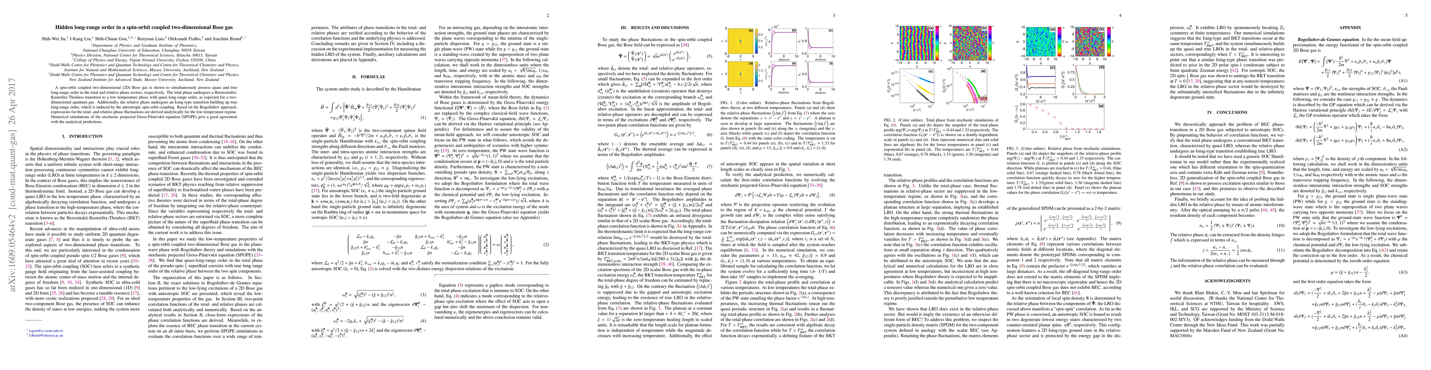 This research reveals that a spin-orbit coupled two-dimensional Bose gas exhibits both quasi and true long-range order in different phase sectors. The total phase shows quasi long-range order via a Berenzinskii-Kosterlitz-Thouless transition, while the relative phase develops true long-range order through an Ising-type transition due to anisotropic spin-orbit coupling. Analytical and numerical results confirm these findings.