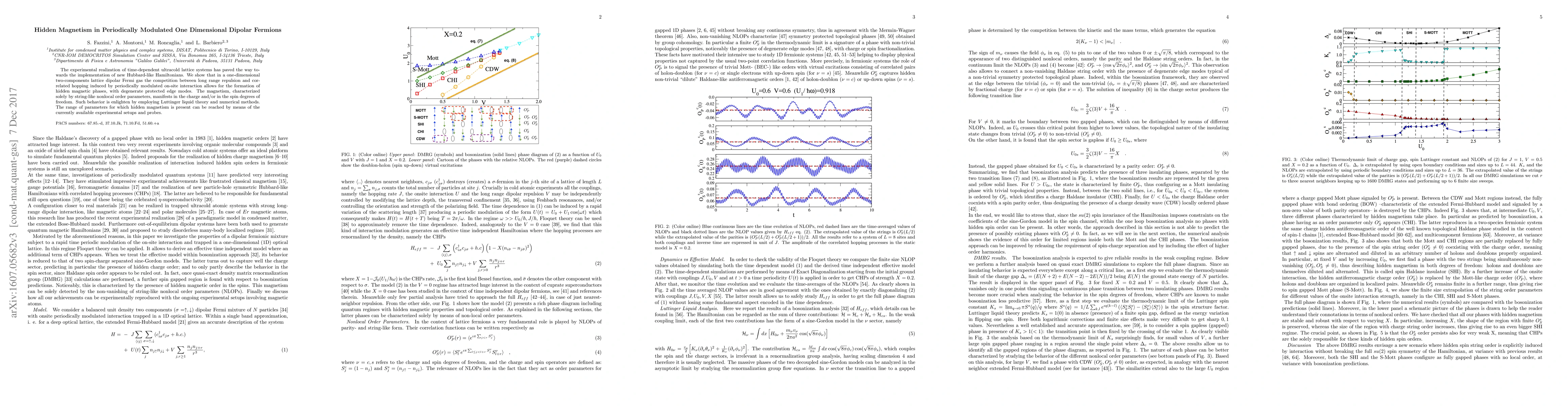 The experimental realization of time dependent ultracold lattice systems has paved the way towards the implementation of new Hubbard-like Hamiltonians. We show that in a one dimensional two components lattice dipolar Fermi gas the competition between long range repulsion and correlated hopping induced by periodically modulated on-site interaction allows for the formation of exotic hidden magnetic phases. The magnetism, characterized solely by string-like nonlocal order parameters, manifests itself both in the charge and, noticeably, in the spin degrees of freedom. Such behavior is enlighten by employing both Luttinger theory and numerical methods. Crucially the range of parameters for which hidden magnetism is present can be reached by means of the currently available experimental setups and probes.