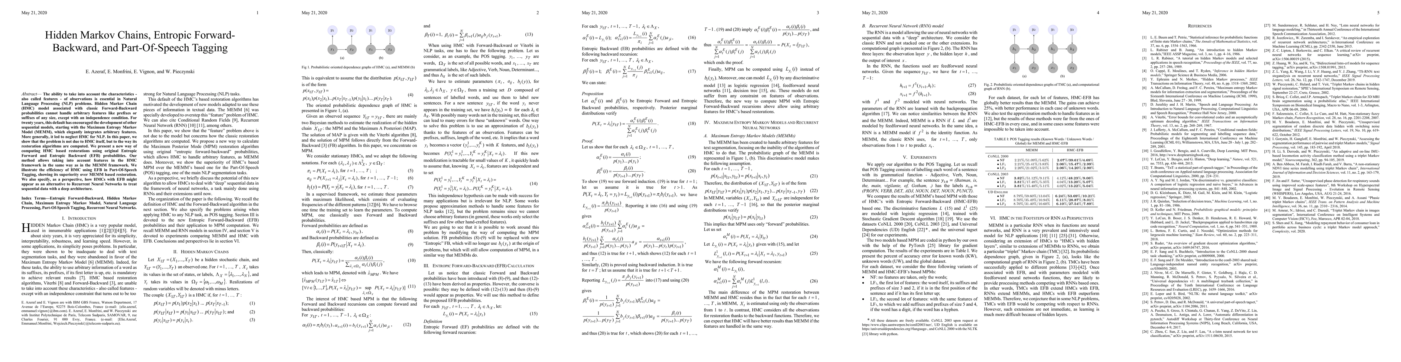 The ability to take into account the characteristics - also called features - of observations is essential in Natural Language Processing (NLP) problems. Hidden Markov Chain (HMC) model associated with classic Forward-Backward probabilities cannot handle arbitrary features like prefixes or suffixes of any size, except with an independence condition. For twenty years, this default has encouraged the development of other sequential models, starting with the Maximum Entropy Markov Model (MEMM), which elegantly integrates arbitrary features. More generally, it led to neglect HMC for NLP. In this paper, we show that the problem is not due to HMC itself, but to the way its restoration algorithms are computed. We present a new way of computing HMC based restorations using original Entropic Forward and Entropic Backward (EFB) probabilities. Our method allows taking into account features in the HMC framework in the same way as in the MEMM framework. We illustrate the efficiency of HMC using EFB in Part-Of-Speech Tagging, showing its superiority over MEMM based restoration. We also specify, as a perspective, how HMCs with EFB might appear as an alternative to Recurrent Neural Networks to treat sequential data with a deep architecture.