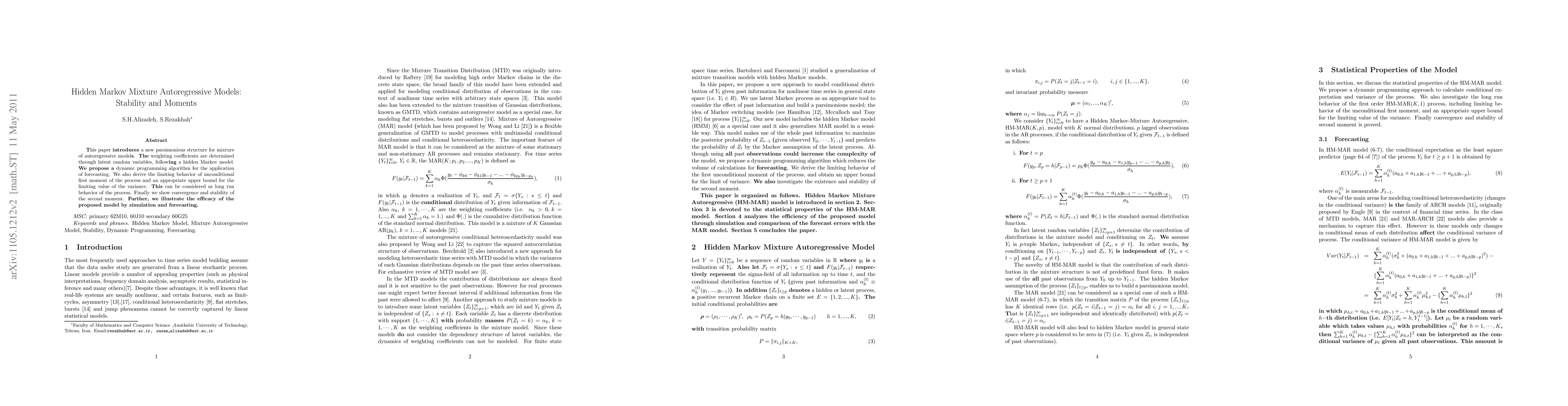 This paper proposes a Hidden Markov Mixture Autoregressive Model with latent weighting coefficients determined by a hidden Markov model, introducing a dynamic programming algorithm for forecasting. It also derives the long-run behavior of the process's first moment and variance, and demonstrates stability and convergence of the second moment.