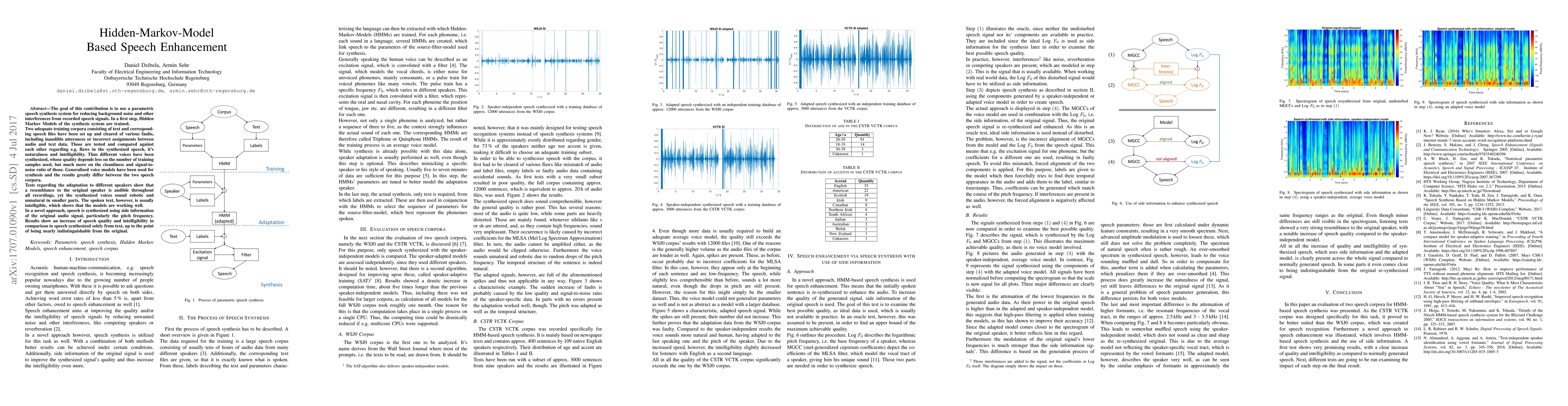 The goal of this contribution is to use a parametric speech synthesis system for reducing background noise and other interferences from recorded speech signals. In a first step, Hidden Markov Models of the synthesis system are trained. Two adequate training corpora consisting of text and corresponding speech files have been set up and cleared of various faults, including inaudible utterances or incorrect assignments between audio and text data. Those are tested and compared against each other regarding e.g. flaws in the synthesized speech, it's naturalness and intelligibility. Thus different voices have been synthesized, whose quality depends less on the number of training samples used, but much more on the cleanliness and signal-to-noise ratio of those. Generalized voice models have been used for synthesis and the results greatly differ between the two speech corpora. Tests regarding the adaptation to different speakers show that a resemblance to the original speaker is audible throughout all recordings, yet the synthesized voices sound robotic and unnatural in smaller parts. The spoken text, however, is usually intelligible, which shows that the models are working well. In a novel approach, speech is synthesized using side information of the original audio signal, particularly the pitch frequency. Results show an increase of speech quality and intelligibility in comparison to speech synthesized solely from text, up to the point of being nearly indistinguishable from the original.
