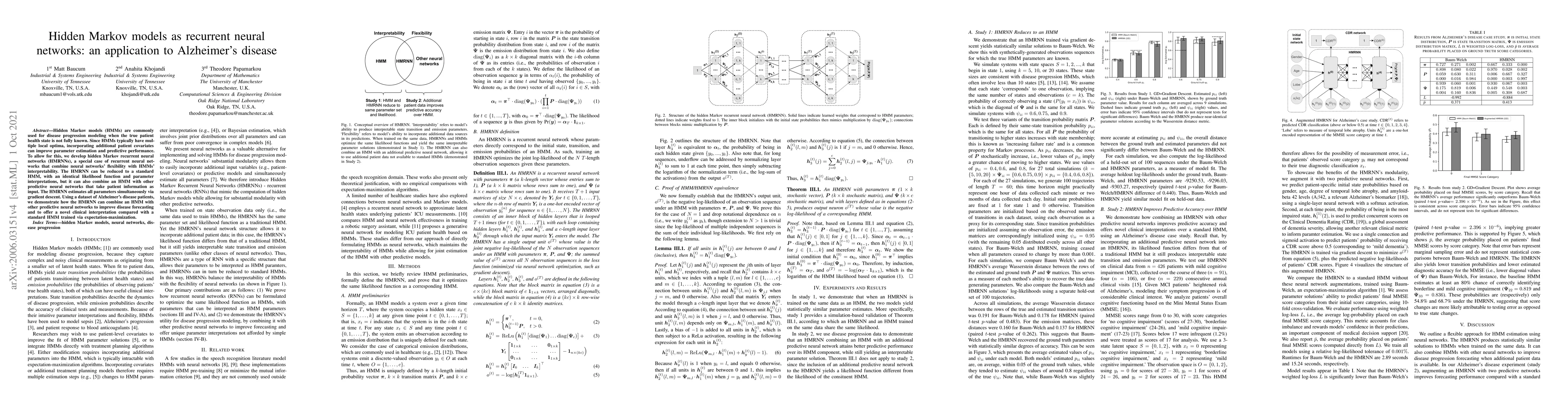 This paper introduces hidden Markov recurrent neural networks (HMRNNs) to model Alzheimer's disease progression, combining the interpretability of hidden Markov models (HMMs) with the flexibility of neural networks. The HMRNNs improve parameter estimation and predictive performance by incorporating additional patient covariates, demonstrating enhanced forecasting and novel clinical insights compared to standard HMMs.
