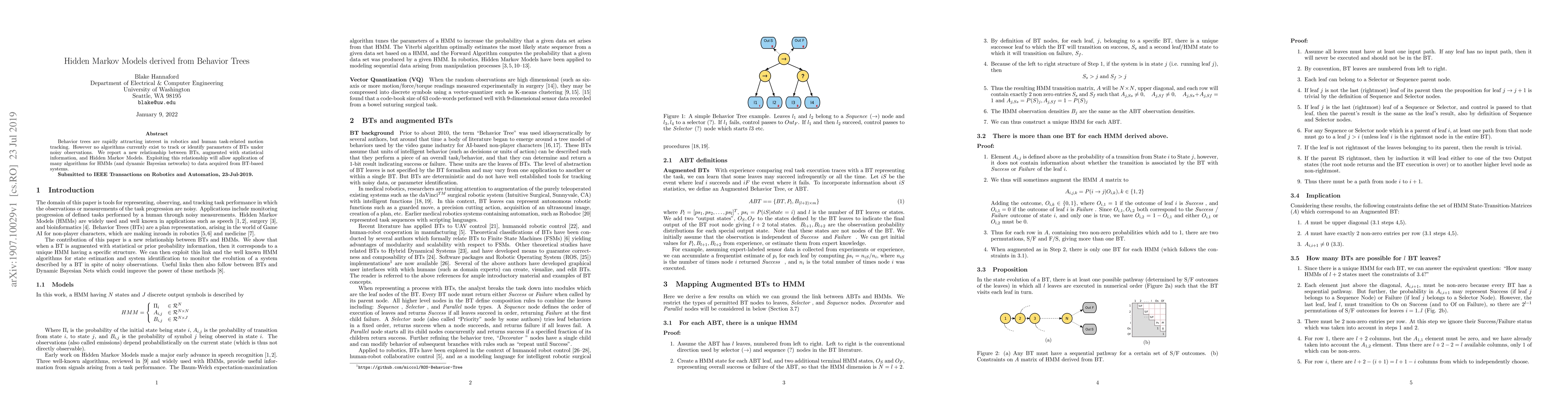 Behavior trees are rapidly attracting interest in robotics and human task-related motion tracking. However no algorithms currently exist to track or identify parameters of BTs under noisy observations. We report a new relationship between BTs, augmented with statistical information, and Hidden Markov Models. Exploiting this relationship will allow application of many algorithms for HMMs (and dynamic Bayesian networks) to data acquired from BT-based systems.