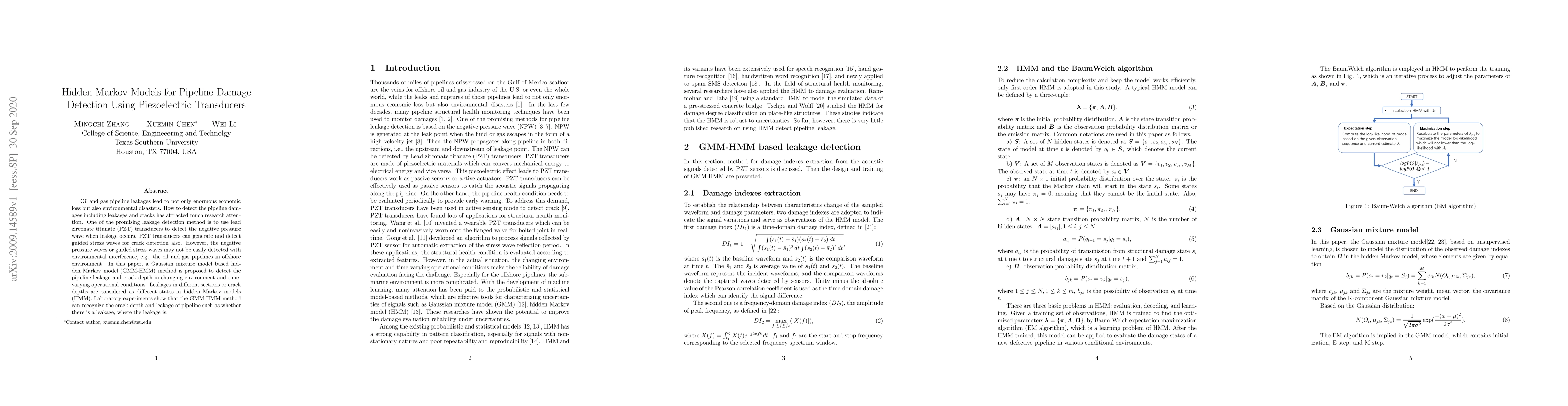 This paper proposes a Gaussian mixture model based hidden Markov model (GMM-HMM) for detecting pipeline damage using piezoelectric transducers, addressing challenges posed by environmental interference and varying operational conditions. Laboratory experiments demonstrate the GMM-HMM method's effectiveness in identifying leakage and crack depth.
