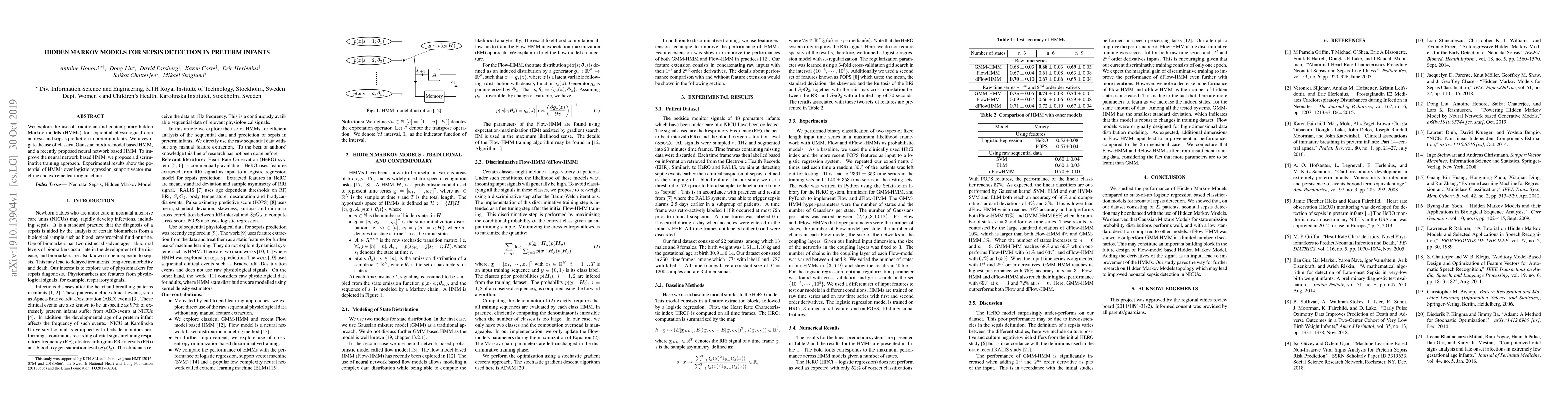 This paper investigates the application of hidden Markov models (HMMs) for predicting sepsis in preterm infants using sequential physiological data. It compares traditional Gaussian mixture model-based HMMs with a novel neural network-based HMM, proposing a discriminative training method to enhance the latter, and demonstrates superior performance over logistic regression, support vector machines, and extreme learning machines.